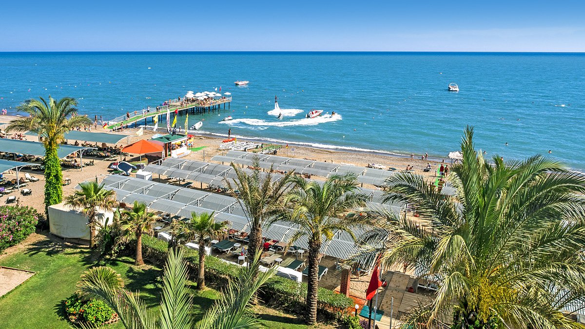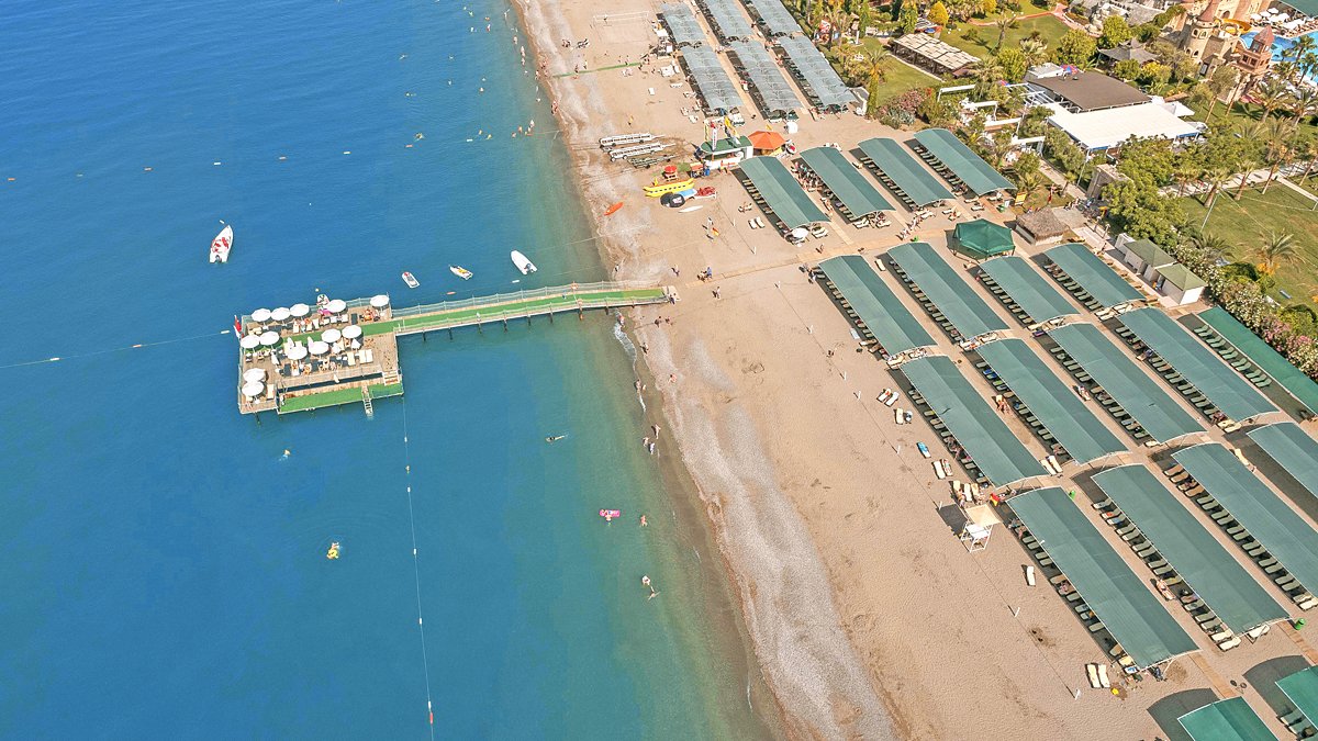 hotelowa, piaszczysto-żwirkowa, łagodne zejście do morza, wyróżniona certyfikatem Błękitna Flaga, bezpłatne leżaki, materace i ręczniki, namioty nad leżakami, zacieniony plac zabaw dla dzieci z piaskownicą i bieżącą słodką wodą, hotelowe molo; bar objęty all inclusive.