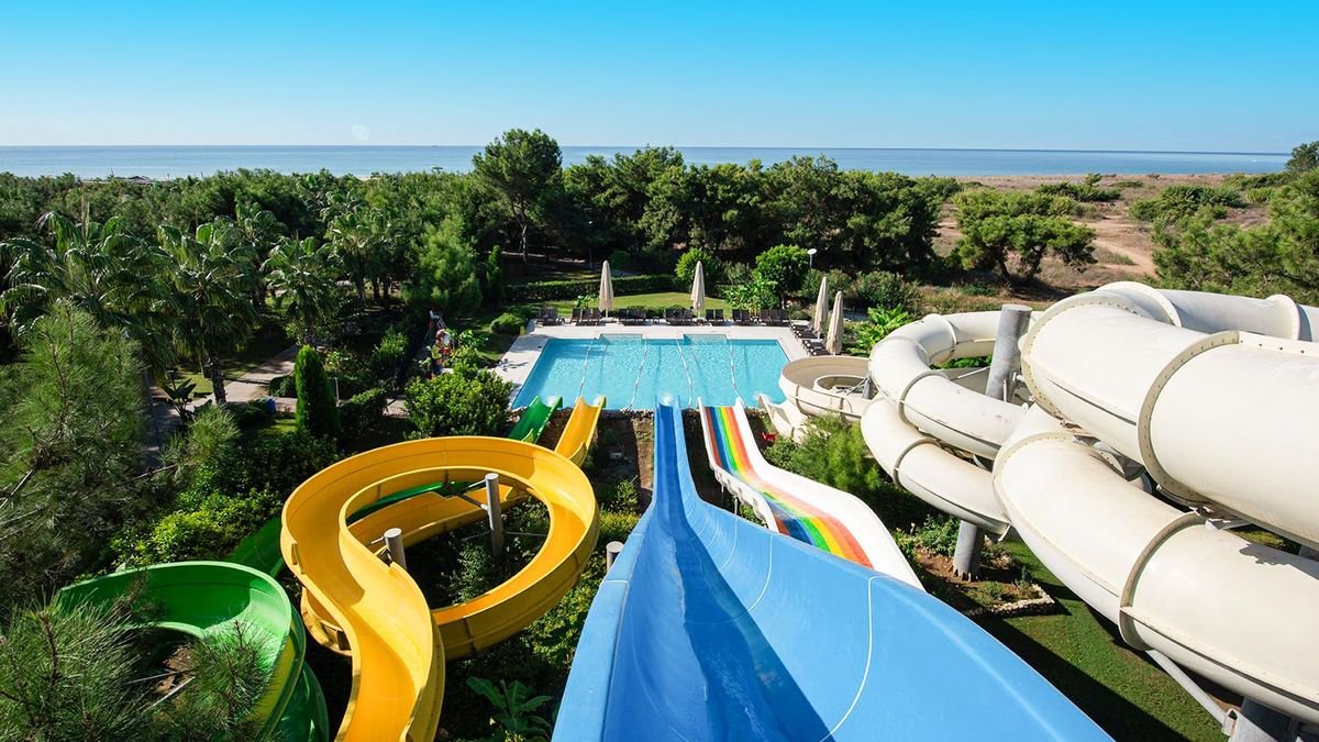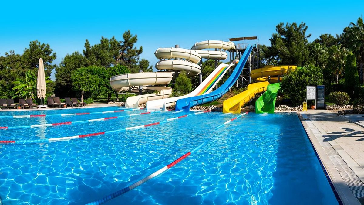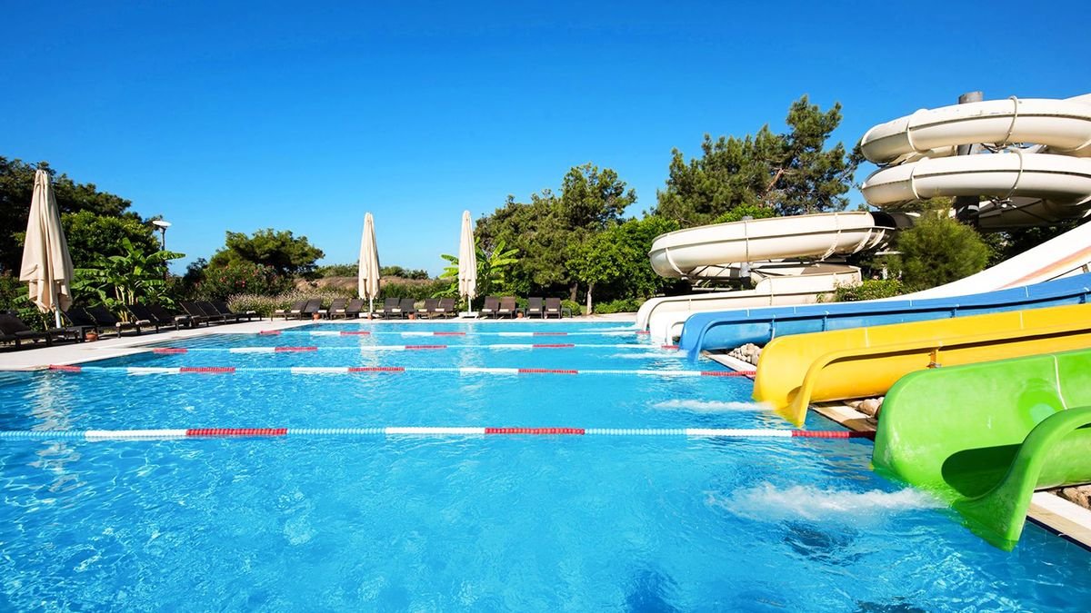 •basen, słodka woda, ok. 180 m², gł. 1,4 m, 5 zjeżdżalni•przy basenach bezpłatne parasole, leżaki i ręczniki