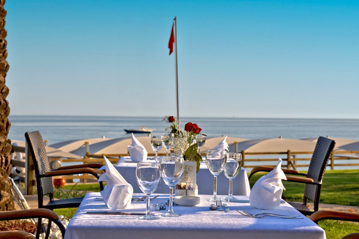 hotelowa, piaszczysta, łagodne zejście do morza, wyróżnione certyfikatem Błękitna Flaga, tuż przy hotelu, dojście przez teren hotelu, bezpłatne parasole, leżaki, materace i ręczniki; bar na plaży.
