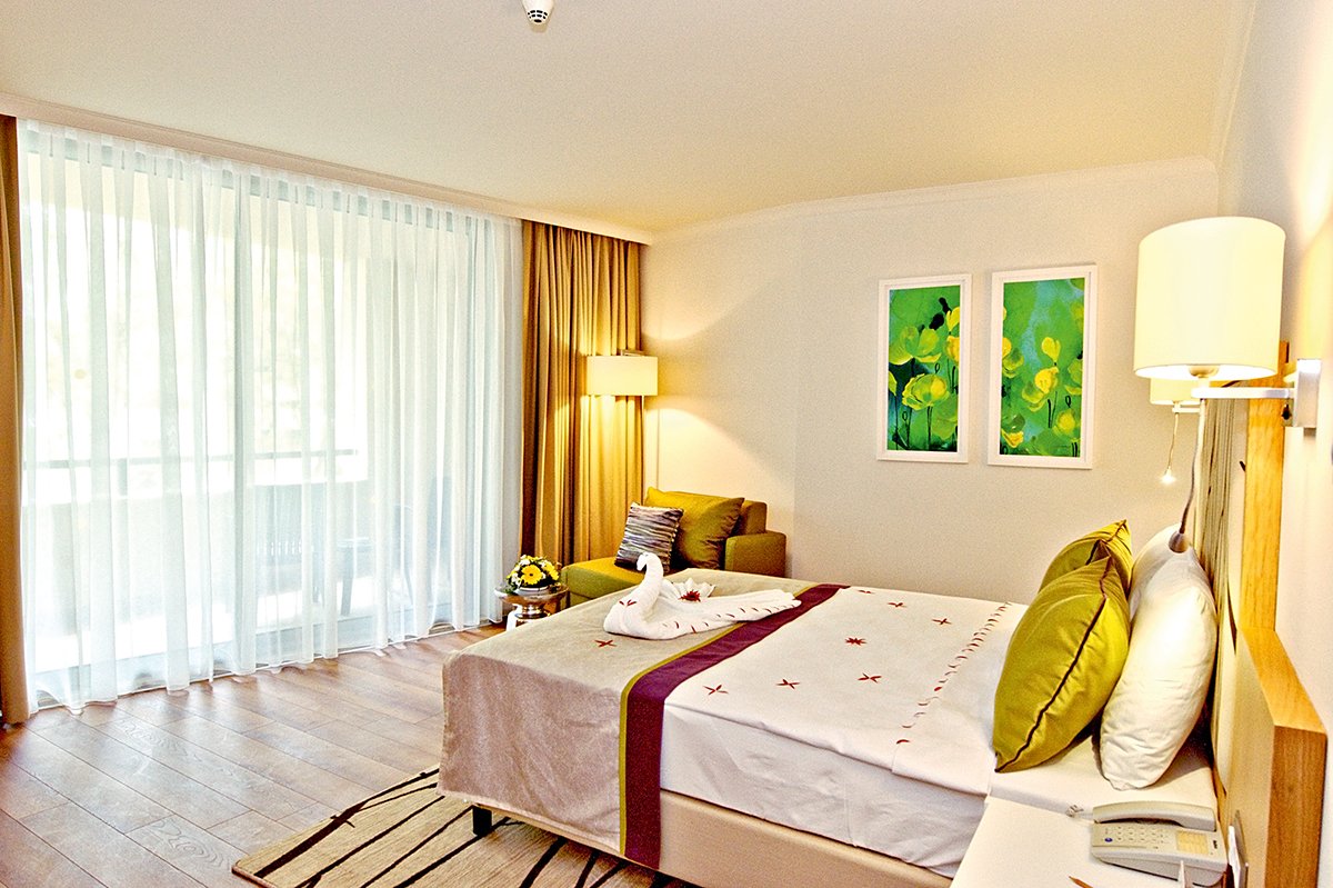 standardowy: 2-os. (możliwość 1 dostawki dla os. dorosłej lub 2 dzieci), ok. 32 m², zadbany, nowoczesny, klimatyzowany, łazienka (wanna z prysznicem, wc; suszarka), internet bezprzewodowy, telewizja satelitarna, telefon, minibar (na powitanie woda i soki), sejf; bezpłatne łóżeczko dla dziecka do 2 lat na zamówienie przed przyjazdem; balkon (stolik i krzesełka), widok na morze, ogród i basen; life family: 4-os. (w tym maks. 3 os. dorosłe), ok. 60 m², dwupomieszczeniowy, zadbany, nowoczesny, wyposażenie jak w pokoju standardowym.