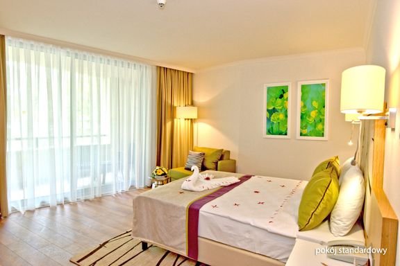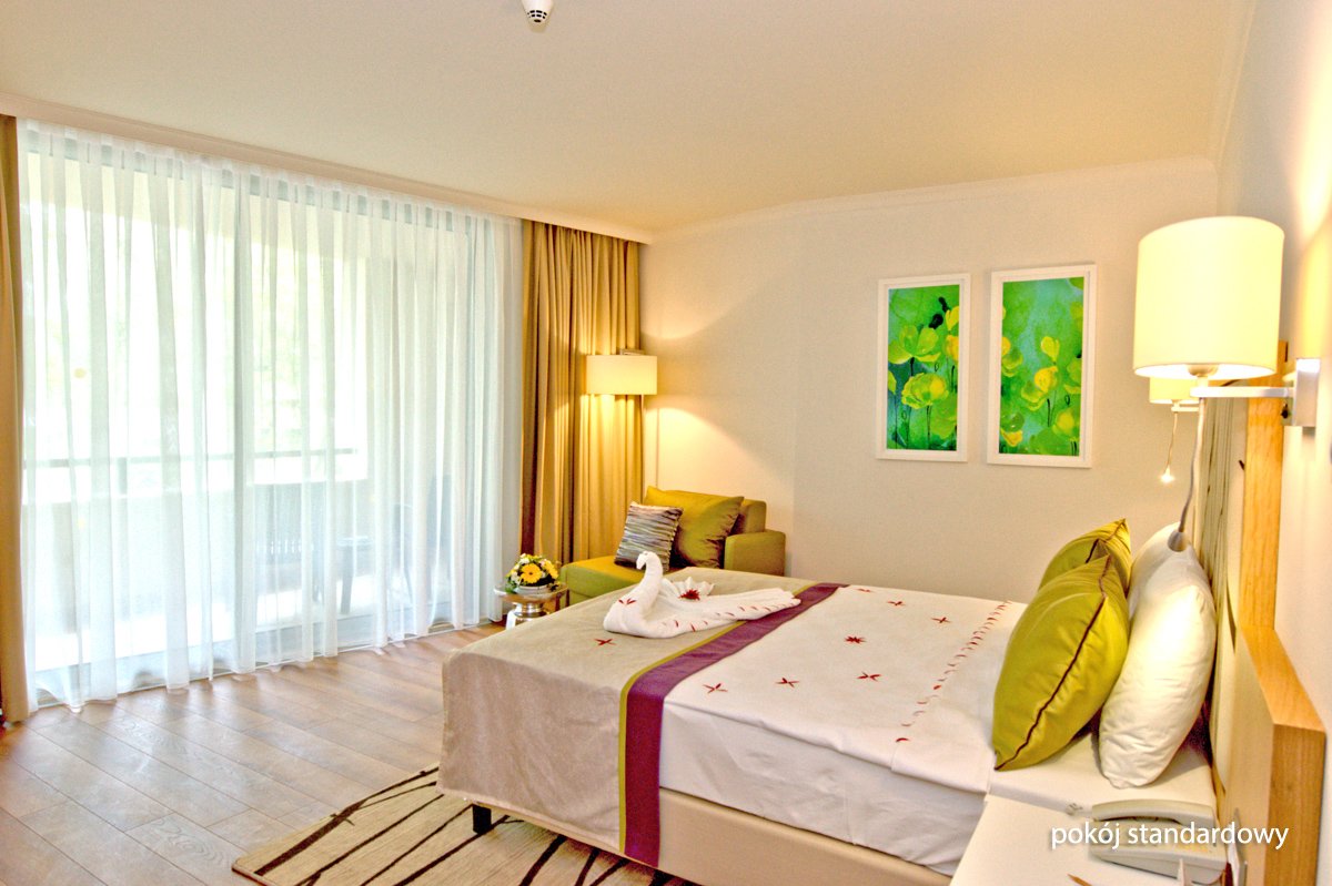 standardowy: 2-os. (możliwość 1 dostawki dla os. dorosłej lub 2 dzieci), ok. 32 m², nowoczesny, klimatyzowany, łazienka (prysznic, wc; suszarka), internet bezprzewodowy, telewizja satelitarna, telefon, minibar (na powitanie woda), sejf; bezpłatne łóżeczko dla dziecka do 2 lat na zamówienie przed przyjazdem; balkon (stolik i krzesełka), widok na ogród.