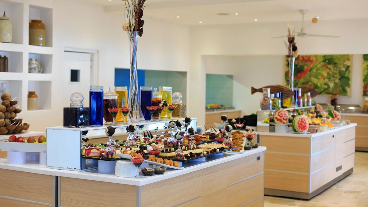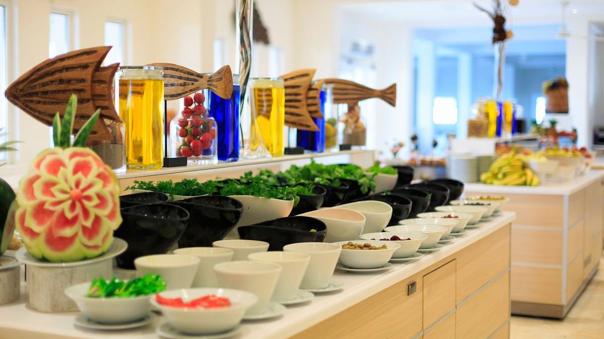 śniadanie (7.00-10.00), późne śniadanie (10.00-11.00), obiad (12.30-14.30), kolacja (19.30-21.00) w formie bufetu w restauracji głównej; przekąski (14.30-17.00) w snack barze; kawa, herbata, ciasto (17.00-18.00) w barze; nocna zupa (23.00-24.00); napoje bezalkoholowe i lokalne napoje alkoholowe (10.00-24.00) w barach.