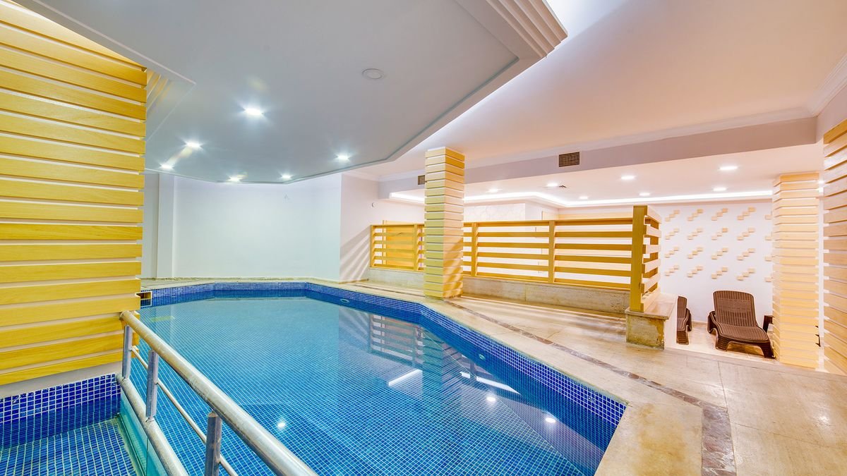•przy basenach bezpłatne parasole, leżaki i materace•kryty basen, nieregularny kształt, słodka woda, ok. 40 m², gł. 1,6