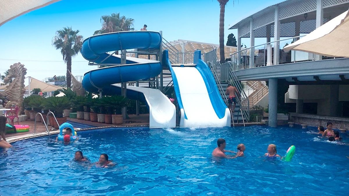 •2 baseny, nieregularny kształt, słodka woda, ok. 260 m², gł. 1,6-1,8 m•2 zjeżdżalnie•brodzik, słodka woda, ok. 110 m²