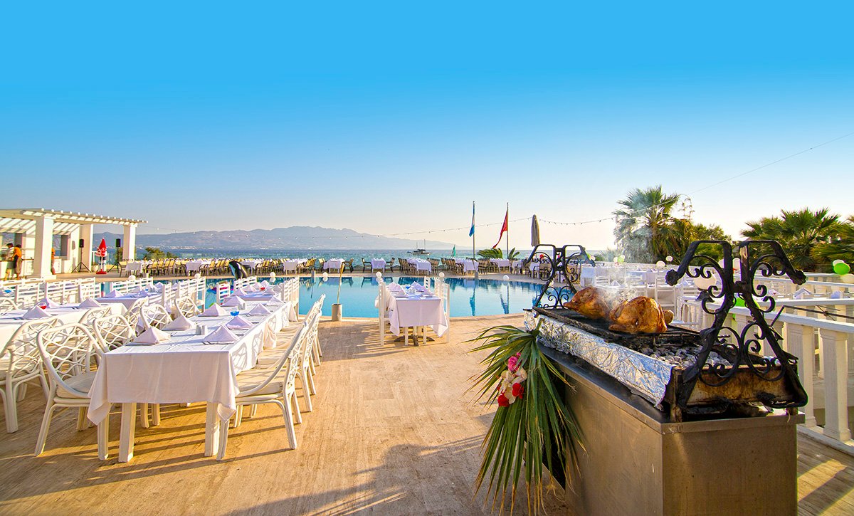śniadanie (7.00-10.00), obiad (13.00-14.30), kolacja (19.30-21.30) w formie bufetu w restauracji głównej; przekąski w barze na plaży (12.30-17.00); gozleme (11.00-17.00); kawa, herbata, ciasto (12.00-17.00); lody (15.00-17.00); napoje bezalkoholowe i lokalne napoje alkoholowe (10.00-23.00); raz na pobyt kolacja w restauracji á la carte; wymagane noszenie opasek all inclusive.