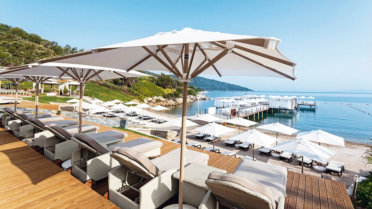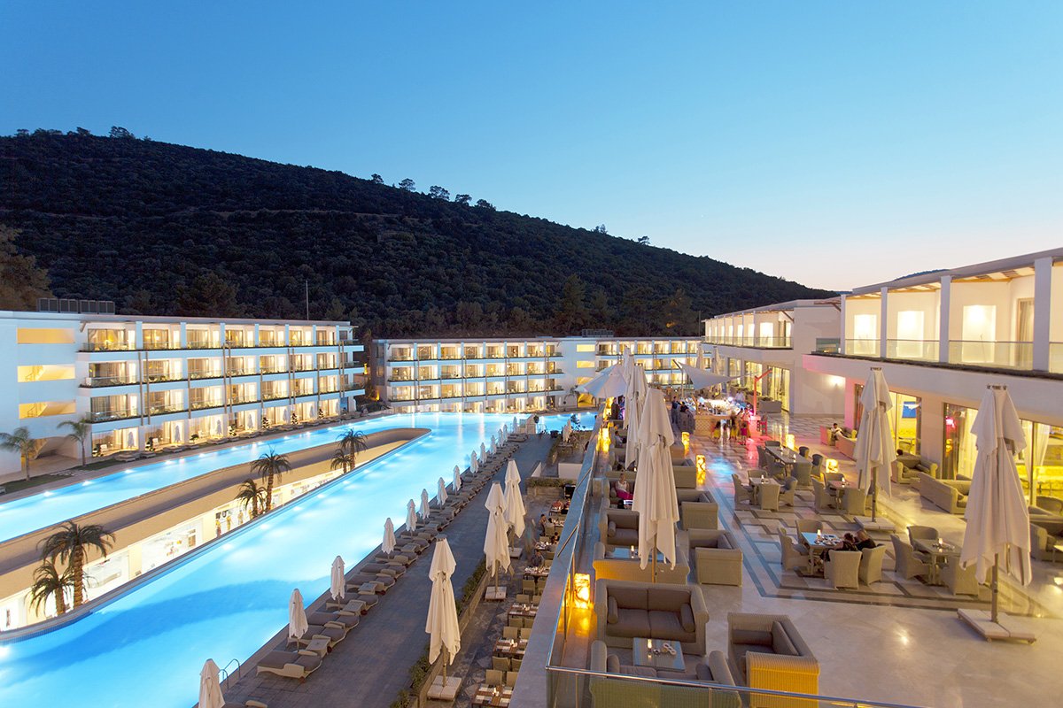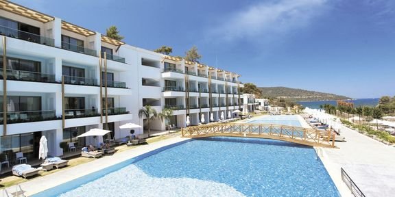 w zatoce, w spokojnej okolicy, ok. 2 km od centrum miejscowości Torba ze sklepami i barami, ok. 10 km od centrum BODRUM; ok. 25 km od portu lotniczego w Bodrum; płatny bus hotelowy (Bodrum).