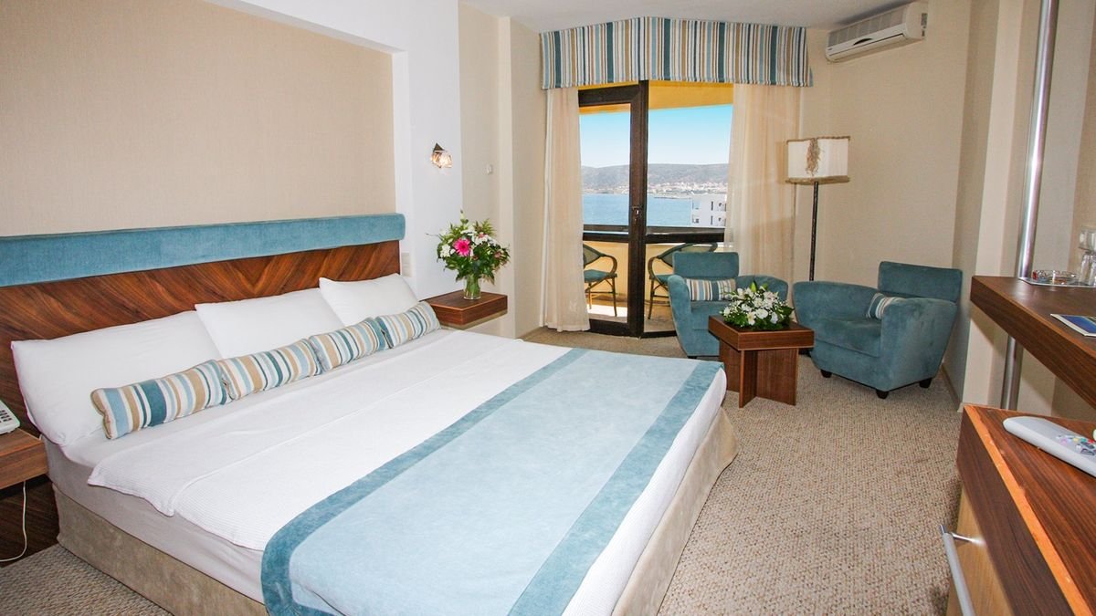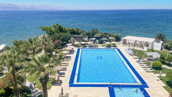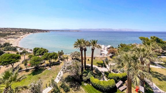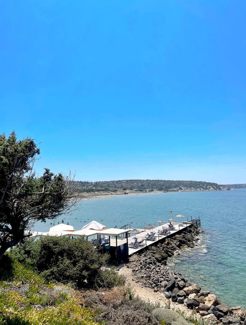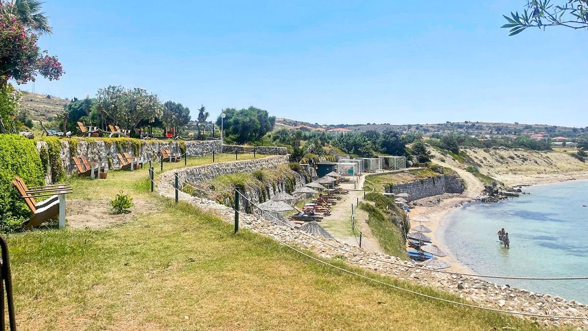 Położony przy piaszczystej plaży w pobliżu miejscowości Çiftlikköy, której centrum znane jest z doskonałych restauracji serwujących owoce morza, zaś pobliska plaża uznawana jest za najlepszą po Alacati pod względem możliwości uprawiania windsurfingu i kitesurfingu. Cała okolica słynie z naturalnych piaszczystych plaż, które mają łagodne zejścia do wody, przez co idealnie nadają się dla rodzin z dziećmi. Dzięki lokalizacji na niewielkim wzniesieniu roztacza się z niego przepiękny widok na morze oraz na grecką wyspę Chios. Wszystkie pokoje mają widok na morze!