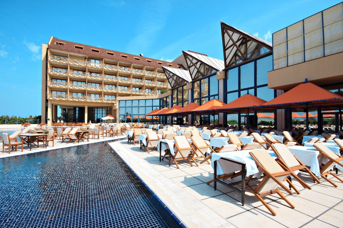pięciogwiazdkowy, nowoczesny i elegancki, o wysokim standardzie, zbudowany w 2001 r., odnowiony w 2011 r., 200 pokoi, 7 pięter, 5 wind, lobby, całodobowa recepcja, restauracja główna – dania w formie bufetu, dostępne foteliki dla dzieci, dania wegetariańskie, bar przy basenie, snack bar, bar przy plaży, bar Atrium, bar Sakiz; minicentrum handlowe; 6 sal konferencyjnych (od 20 do 400 osób), taras, ogród, bezpłatny internet bezprzewodowy w lobby; za opłatą: kawiarenka internetowa, room-service, opiekunka do dziecka, pralnia, wypożyczalnia samochodów; akceptowane karty kredytowe: Visa, MasterCard.