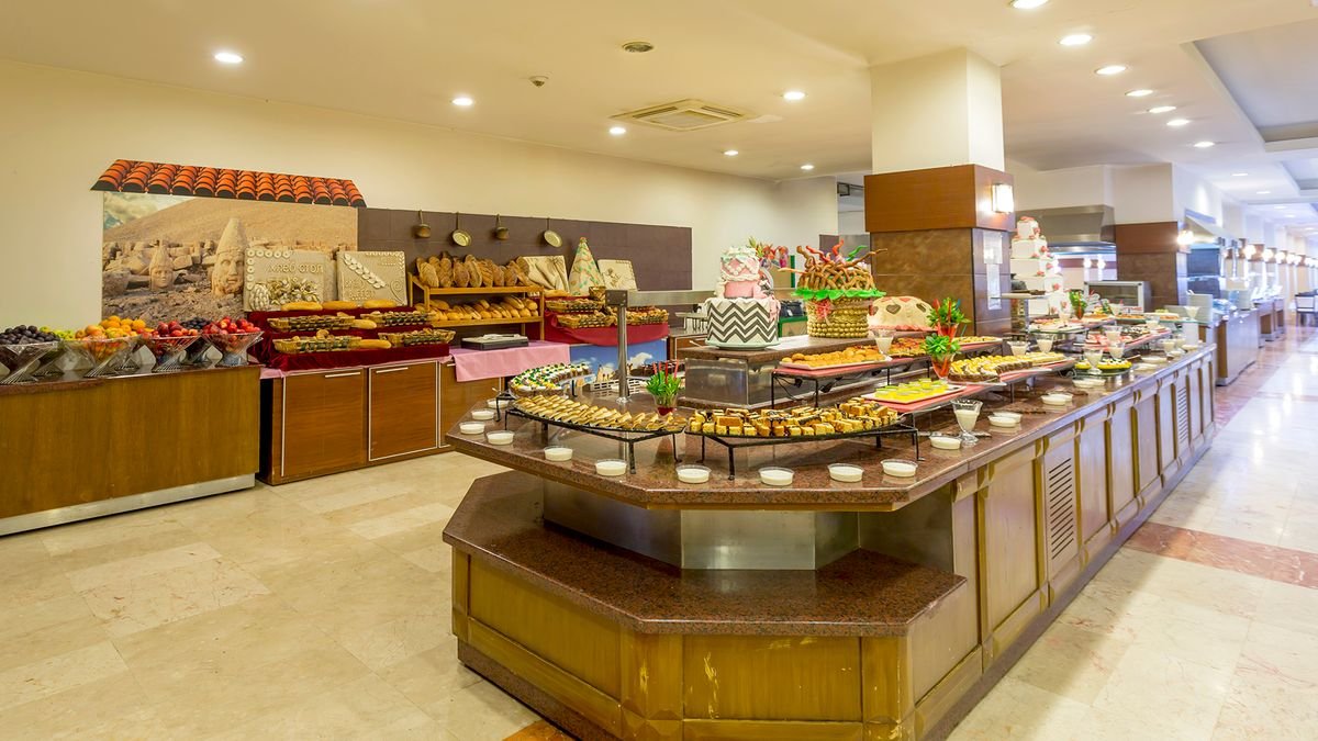 śniadanie (7.00-10.00), obiad (12.30-14.30) i kolacja (19.00-21.00) w formie bufetu w restauracji głównej; przekąski (12.00-16.00) w restauracji Sofra; podwieczorek (14.00-18.00) w cukierni; nocna zupa (23.30-24.00) w restauracji głównej; napoje bezalkoholowe i lokalne napoje alkoholowe (10.00-2.00) w wyznaczonych barach; raz na pobyt kolacja w restauracji à la carte (tureckiej; wymagana wcześniejsza rezerwacja); wymagane noszenie opasek all inclusive.
