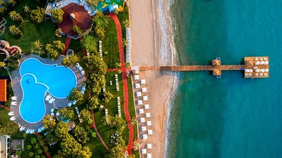 pięciogwiazdkowy, zbudowany w 2002 r., odnowiony w 2014 r., 187 pokoi, 1 budynek, 5 pięter, 4 windy, przestronne lobby, całodobowa recepcja, restauracja główna – dania w formie bufetu, kuchnia turecka, międzynarodowa, 2 restauracje à la carte – kuchnia włoska, francuska, 4 bary, cukiernia; minimarket, sklep z pamiątkami, butik, parking; sala konferencyjna dla maks. 300 osób, ogród, taras z widokiem na ogród i morze, bezpłatny internet bezprzewodowy; za opłatą: fryzjer, pralnia; akceptowane karty kredytowe: Visa, MasterCard.