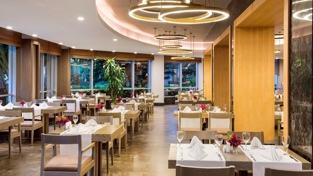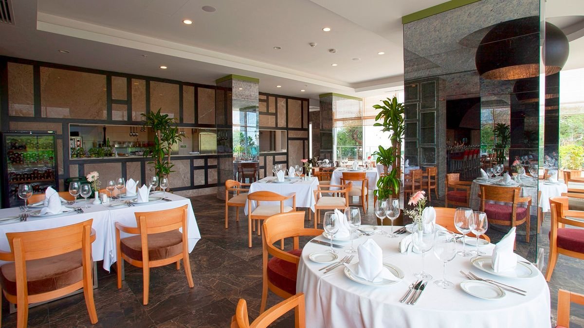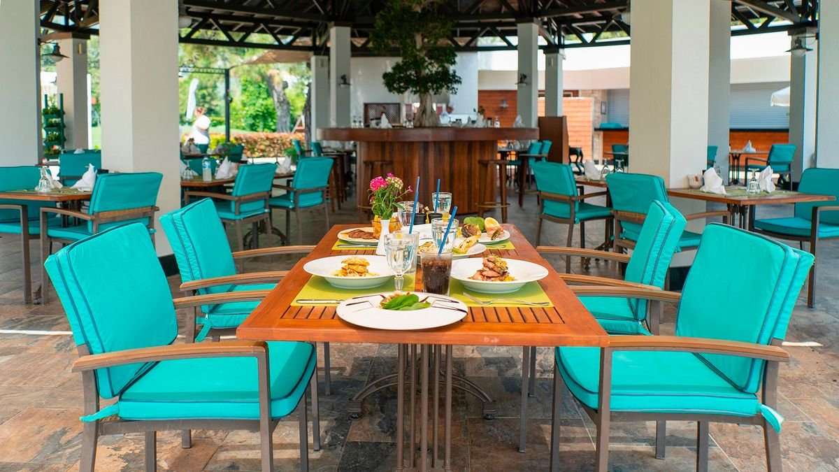 śniadanie (7.00-10.00), późne śniadanie (10.00-11.00), obiad (12.30-14.30), kolacja (19.00-21.30), późna kolacja (24.00-2.00) w formie bufetu w restauracji głównej; przekąski (12.00-18.00) w barze z przekąskami; kawa, herbata, ciasto w cukierni (10.00-18.00), całodobowo napoje bezalkoholowe, lokalne i importowane napoje alkoholowe w barze w lobby; raz na tydzień kolacja w restauracji à la carte (wymagana wcześniejsza rezerwacja); wymagane noszenie opasek all inclusive.