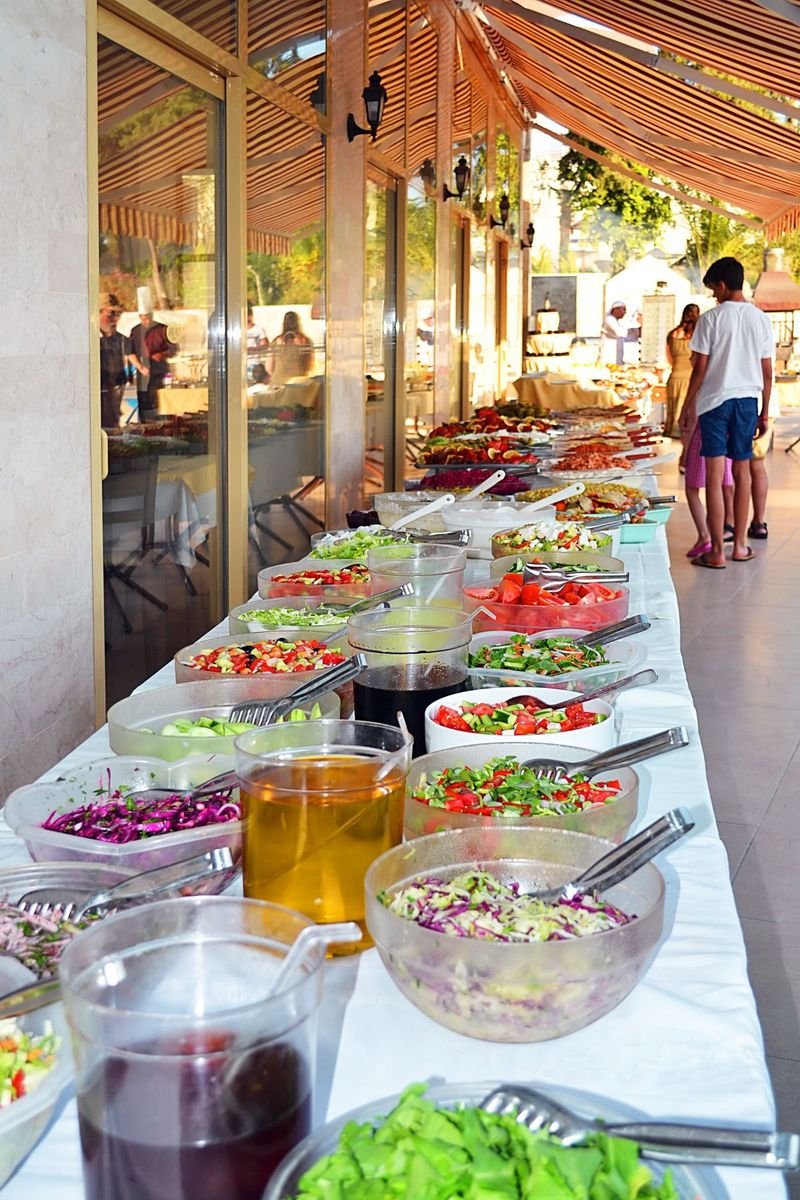 śniadanie (7.00-10.00), obiad (12.30-14.00), kolacja (19.00-21.00) w formie bufetu w restauracji; podwieczorek: kawa, herbata, ciastko (17.00-18.00); przekąski (15.00-16.30) w barze; lokalne napoje alkoholowe i bezalkoholowe (10.00-23.00) w barze; wymagane noszenie opasek all inclusive.