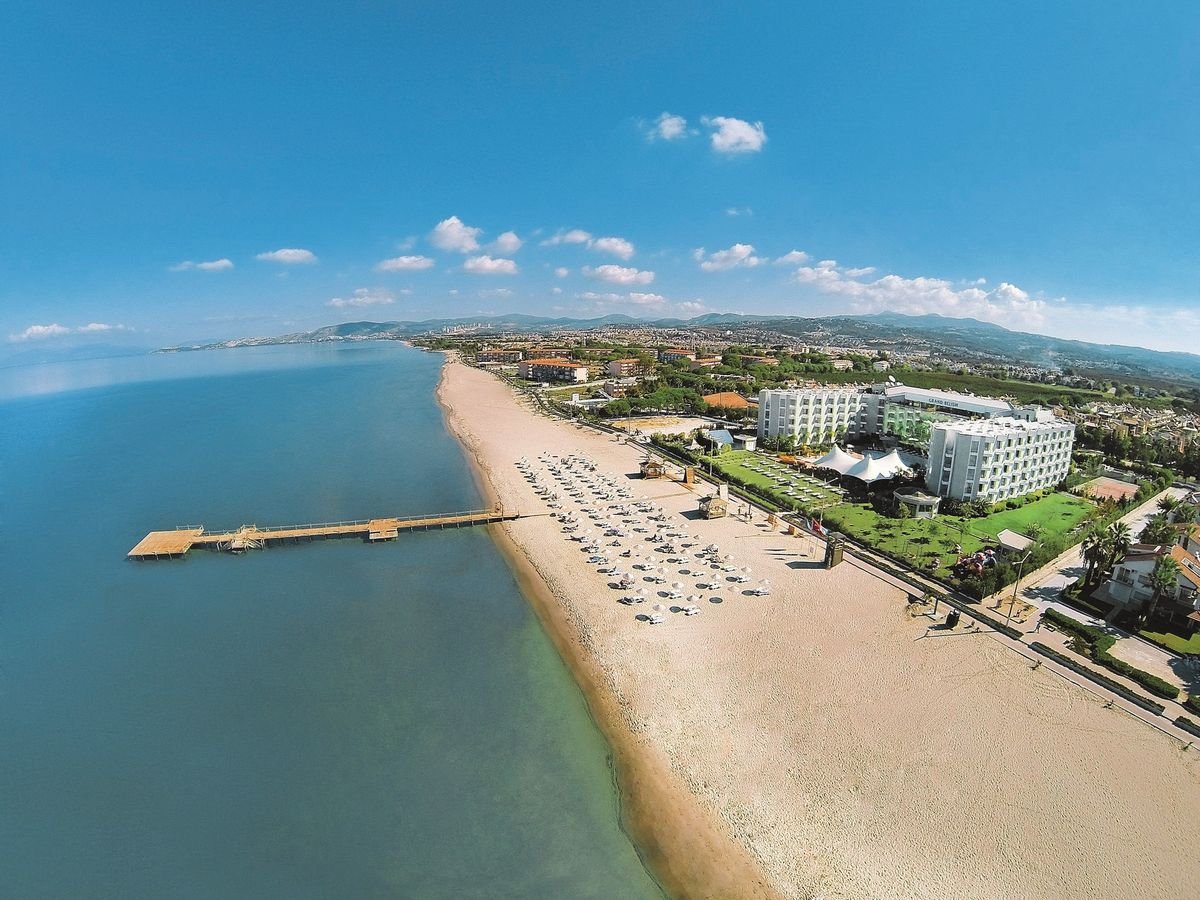 Położony w cichej okolicy, idealny wybór dla wczasowiczów, chcących odpocząć w komfortowych warunkach, a jednocześnie w ładnym otoczeniu blisko pięknej, szerokiej, piaszczystej plaży. Przestronna restauracja z przeszkleniami, ładne pokoje z widokiem na morze – wszystko to sprawia, że hotel należy do godnych polecenia 5-gwiazdkowych obiektów w tym rejonie. Doskonały jako baza wypadowa do zwiedzania słynnego wakacyjnego kurortu, jakim jest Kusadasi.