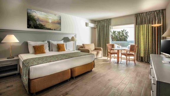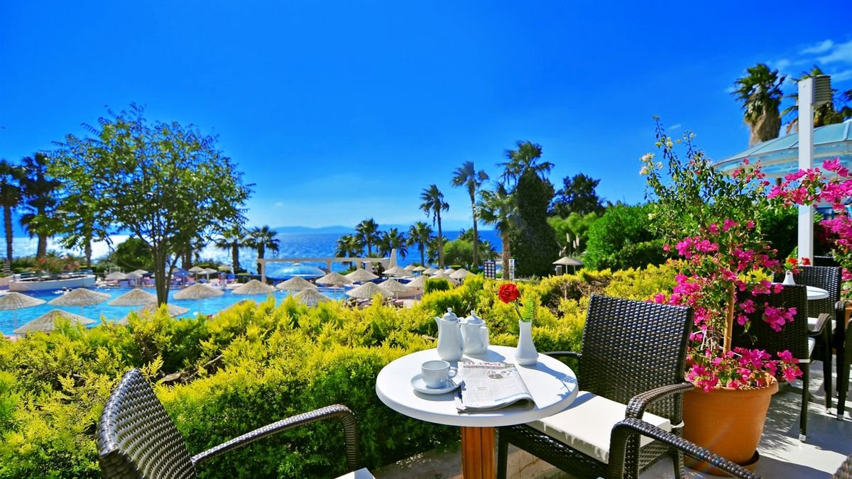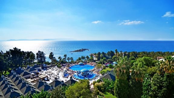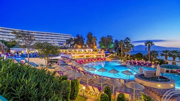 Otoczony zielonym ogrodem, położony na wzniesieniu, tuż przy prywatnej piaszczystej plaży z barem all inclusive, w zasięgu spaceru od centrum miejscowości Kusadasi, pełnej sklepów, restauracji i dyskotek. Z terenu hotelu roztacza się przepiękny widok na błękitne morze. Ciekawie zaprojektowany, tarasowy basen, z którego bez wychodzenia z wody można spróbować pysznych drinków, bogate zaplecze rekreacyjno-sportowe oraz atrakcyjna formuła all inclusive czynią ten hotel idealnym wyborem na beztroskie rodzinne wakacje. Wszystkie obszerne i zadbane pokoje dla naszych Gości posiadają frontalny widok na morze!