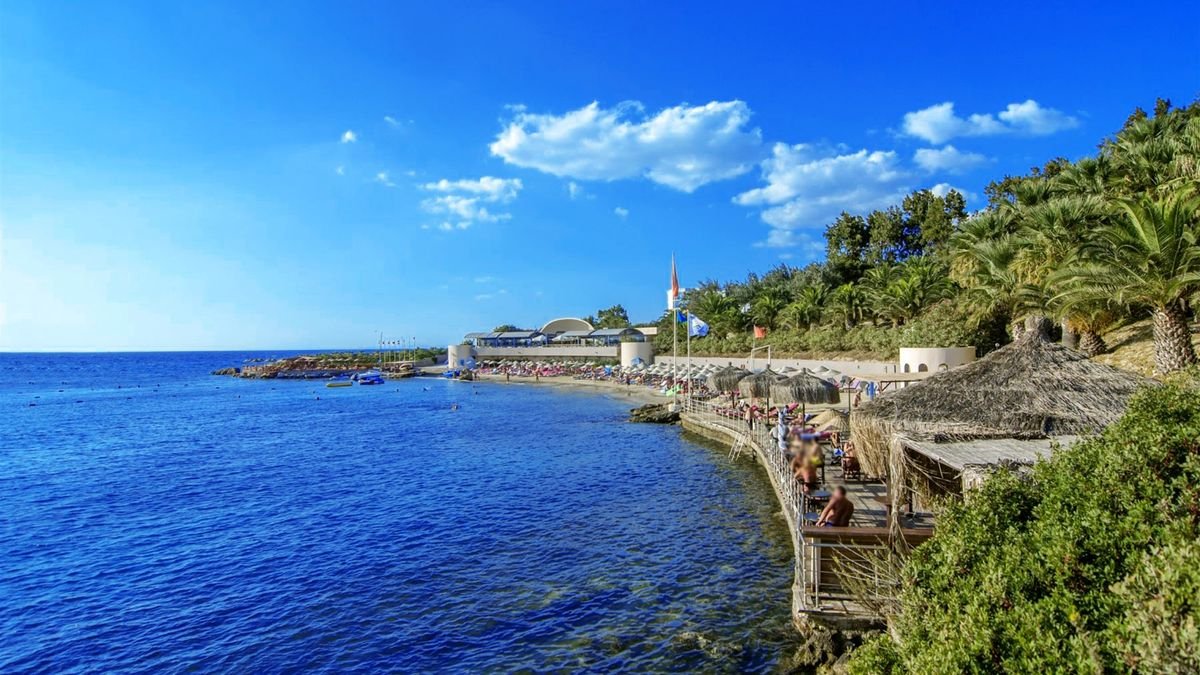 hotelowa, piaszczysta, łagodne zejście do morza, platforma do opalania, molo, bezpośrednio przy hotelu, zejście schodami, bezpłatne parasole, leżaki, materace i ręczniki; bar hotelowy objęty all inclusive.
