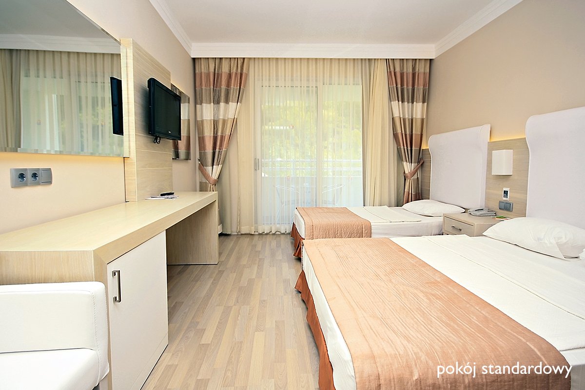 standardowy: 2-os. (możliwość 1 lub 2 dostawek – łóżko piętrowe), ładnie urządzony, ok. 20 m², indywidualnie sterowana klimatyzacja, łazienka (wanna lub prysznic, wc; suszarka), telewizja satelitarna, telefon, minibar (woda na powitanie); bezpłatne łóżeczko dla dziecka do 2 lat; balkon (stolik i krzesełka); rodzinny: 2-os. (możliwość 1 lub 2 dostawek), ok. 43 m², 2 sypialnie oddzielone drzwiami; wyposażenie jak w pokoju standardowym; pokój rodzinny za dopłatą; duplex: 2-os. (możliwość 1 lub 2 dostawek), ok. 45 m², 2 poziomy: na dole pokój dzienny, na górze sypialnia; wyposażenie jak w pokoju standardowym, dodatkowo łazienka z wc; pokój duplex za dopłatą.