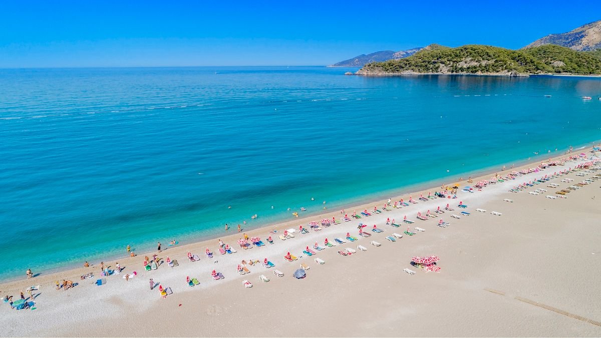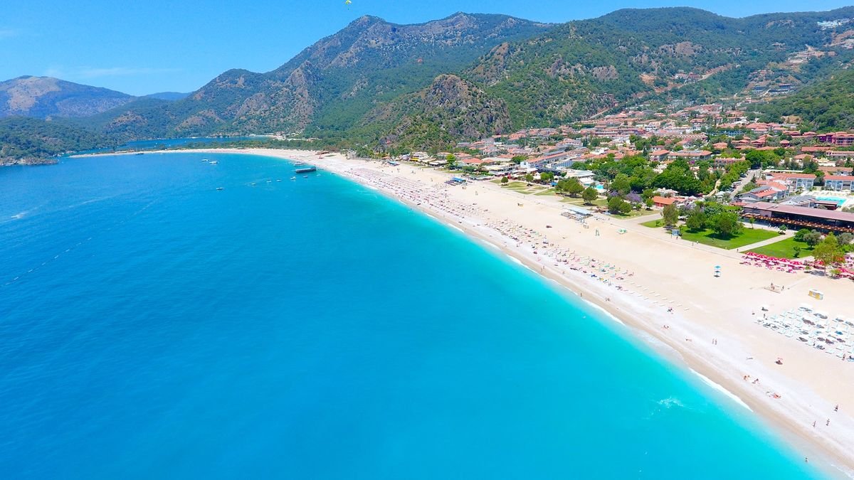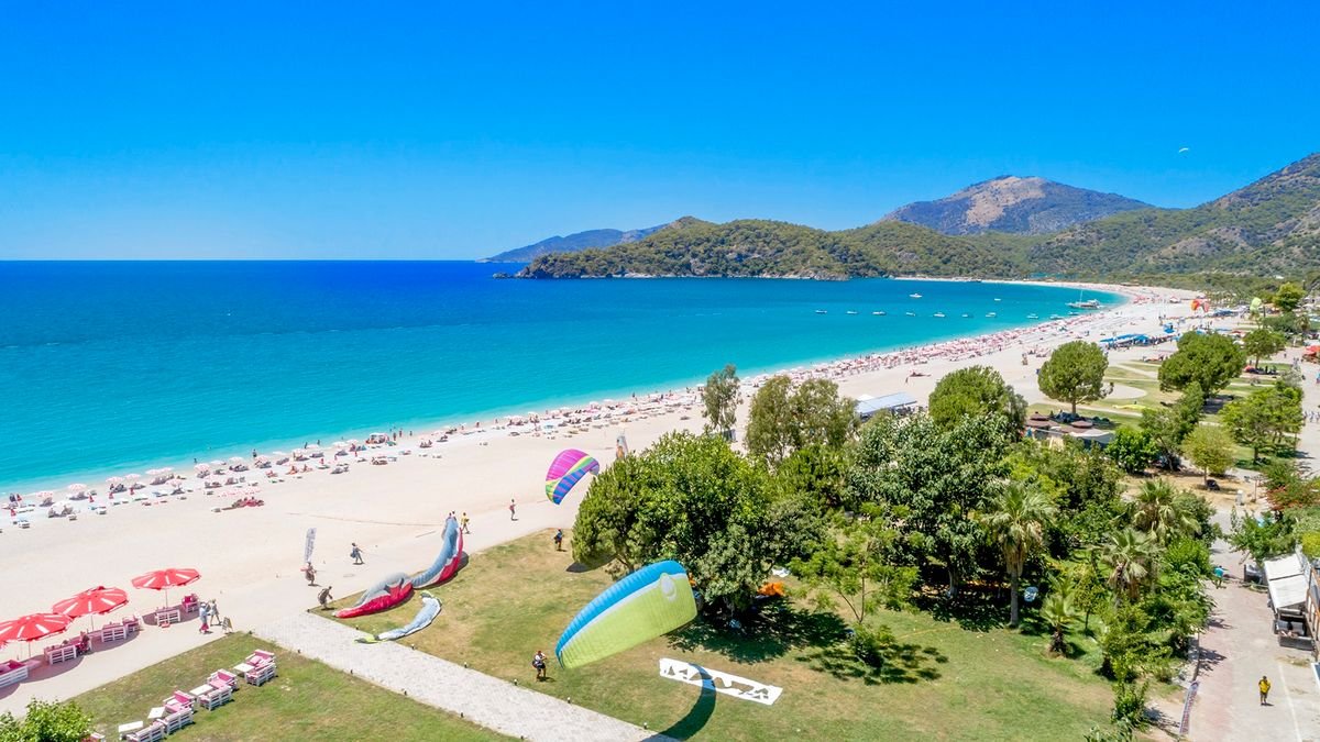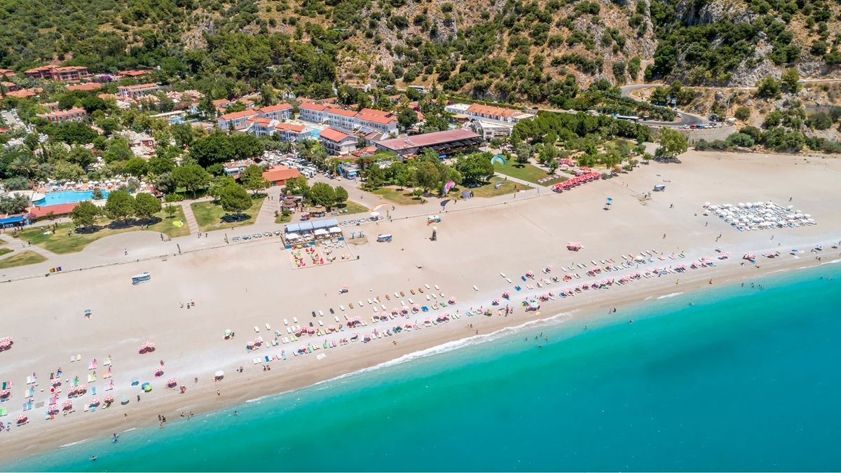 Oludeniz, publiczna, wydzielona część hotelowa, piaszczysto-żwirowa, łagodne zejście do morza, wyróżniona certyfikatem Błękitna Flaga, przejście przez promenadę, bezpłatne parasole i leżaki, ręczniki (wymagany depozyt: ok. 5 EUR); sporty wodne na plaży (płatne, oferta zewnętrzna).