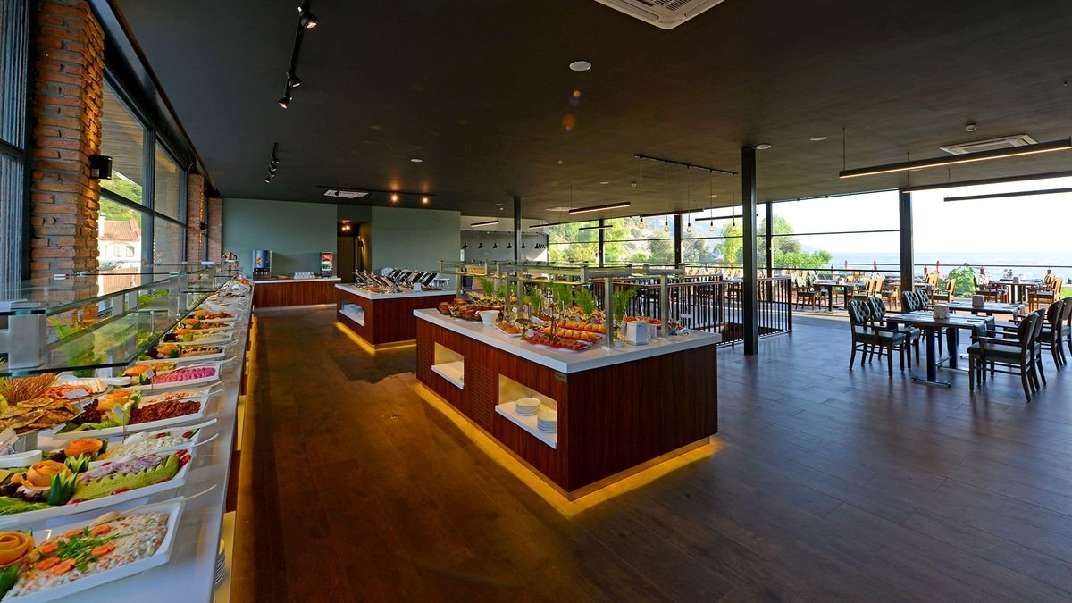 śniadanie (7.30-10.00), późne śniadanie (10.00-10.30), obiad (12.30-14.00), kolacja (19.30-21.30) w formie bufetu w restauracji głównej; nocna zupa (23.00-23.30) w restauracji głównej; przekąski (12.00-17.00), lody (11.00-12.00, 15.00-16.00), kawa, herbata (17.00-18.00) w barze z przekąskami; napoje bezalkoholowe oraz lokalne napoje alkoholowe w barze przy basenie (10.00-23.00) lub w restauracji głównej (w godzinach serwowania posiłków); wymagane noszenie opasek all inclusive.