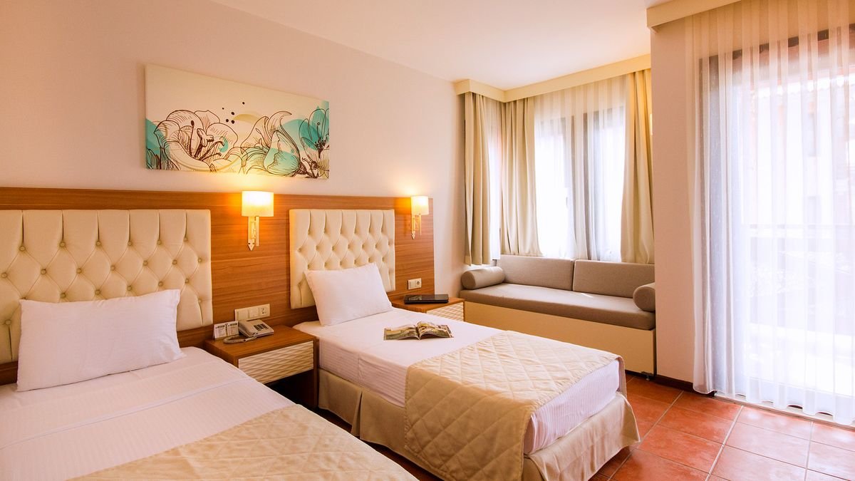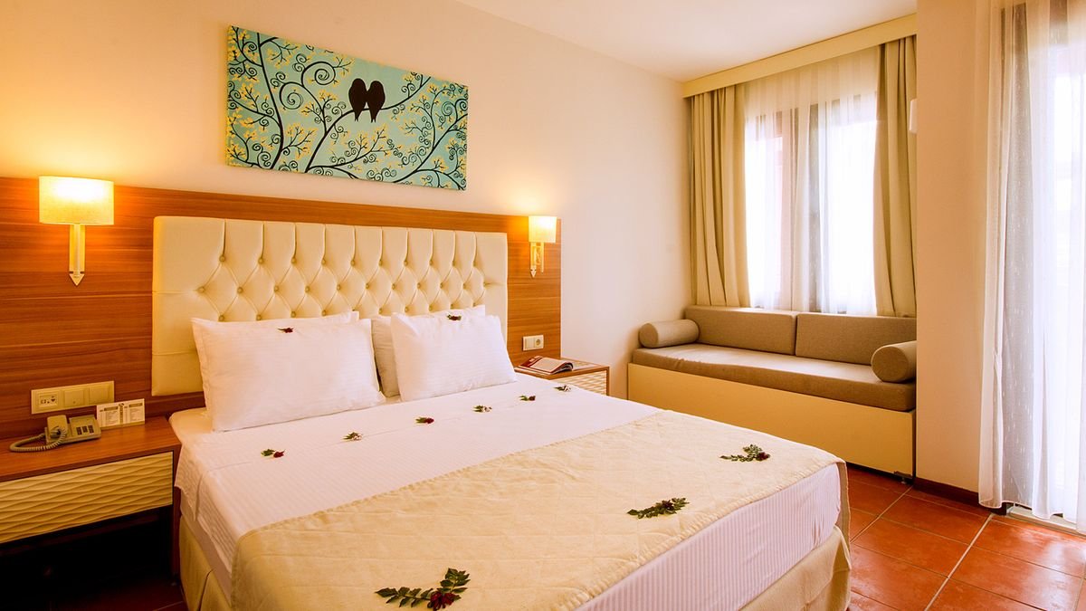 standardowy: 2-os. (możliwość 1 dostawki), ok. 20 m², zadbany, klimatyzowany, łazienka (wanna, wc; suszarka), telewizja satelitarna, telefon, lodówka, sejf (płatny); balkon lub taras (stolik i krzesełka); bezpłatne łóżeczko dla dziecka do 2 lat na zamówienie przed przyjazdem; rodzinny: 2-os. (możliwość 2 dostawek – łóżko piętrowe), ok. 24 m², wyposażenie jak w pokoju standardowym.