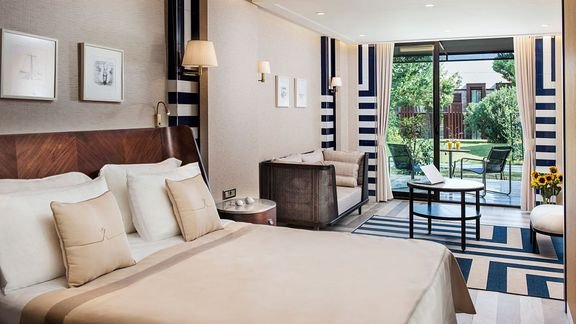 deluxe suite: 2-os., ok. 45 m², elegancki i luksusowy, klimatyzowany, łazienka (prysznic, wc; suszarka, szlafrok, kapcie), internet bezprzewodowy, telewizja satelitarna, telefon, zestaw do kawy/herbaty, minibar, sejf; bezpłatne łóżeczko dla dziecka do 2 lat na zamówienie przed przyjazdem; balkon lub taras (stolik i krzesełka), widok na ogród.