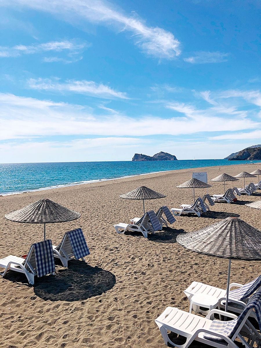 publiczna, wydzielona część hotelowa, piaszczysto-żwirowa, szeroka, o długości 400 m, łagodne zejście do morza, bezpośrednio przy hotelu, przejście przez teren hotelu, wyróżniona certyfikatem Błękitna Flaga, bezpłatne parasole, leżaki i ręczniki; bar objęty all inclusive.