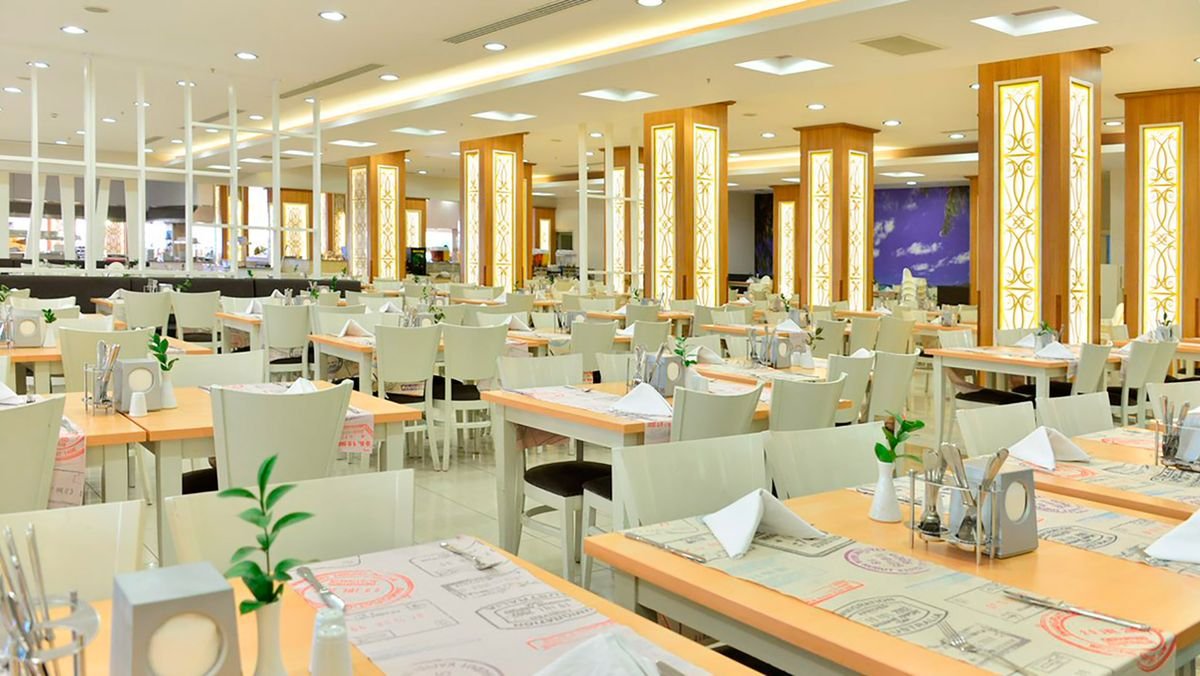 śniadanie (7.00-10.30), późne śniadanie (10.30-11.00), obiad (12.00-14.30), kolacja (18.30-21.00) w formie bufetu w restauracji głównej, dodatkowo w porze obiadu przekąski przy basenie; 2 razy w tygodniu kolacja w wybranej restauracji à la carte (Saray, Spice lub Prima Cucina, wymagana wcześniejsza rezerwacja); przekąski (10.30-16.30), gözleme (11.00-16.30) i lody (15.00-17.00), nocne przekąski w restauracji głównej (23.00-24.00); napoje bezalkoholowe i lokalne napoje alkoholowe w wyznaczonych barach (10.00-24.00); wymagane noszenie opaski all inclusive.
