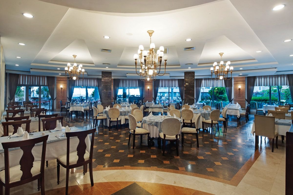 śniadanie (7.00-10.00), późne śniadanie (10.00-10.30), obiad (12.00-13.30), kolacja (19.00-21.00) w formie bufetu w restauracji głównej; kawa, herbata i ciasto (10.00-17.30) i przekąski (11.00-17.30) w barze przy basenie; przekąski w barze na plaży (11.00-16.00); tureckie placki gozleme (11.00-17.30); lody (14.00-16.00); nocna zupa (23.30-00.30); kanapki (00.30-7.00); lokalne napoje bezalkoholowe i lokalne napoje alkoholowe całodobowo w wyznaczonym barze; raz na tydzień kolacja w restauracji à la carte z kuchnią tajską lub rybną (wymagana wcześniejsza rezerwacja); wymagane noszenie opasek all inclusive.