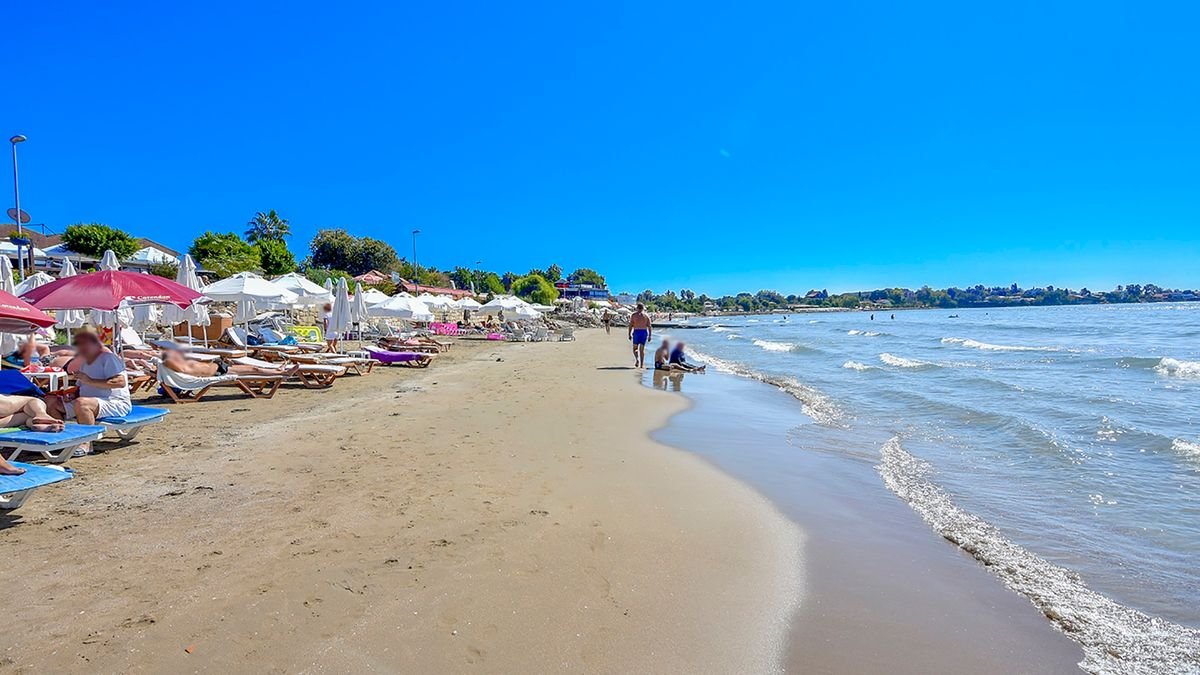 publiczna, wydzielona część hotelowa, piaszczysta, łagodne zejście do morza, ok. 50 m od hotelu, bezpłatne parasole, leżaki i materace.