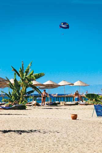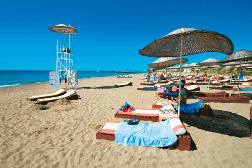 bezpośrednio przy hotelu, długa na 200 m, szeroka, piaszczysta, bar hotelowy objęty all inclusive - napoje chłodzące, przekąski w ciągu dnia; bezpłatne leżaki, parasole, materace i ręczniki.