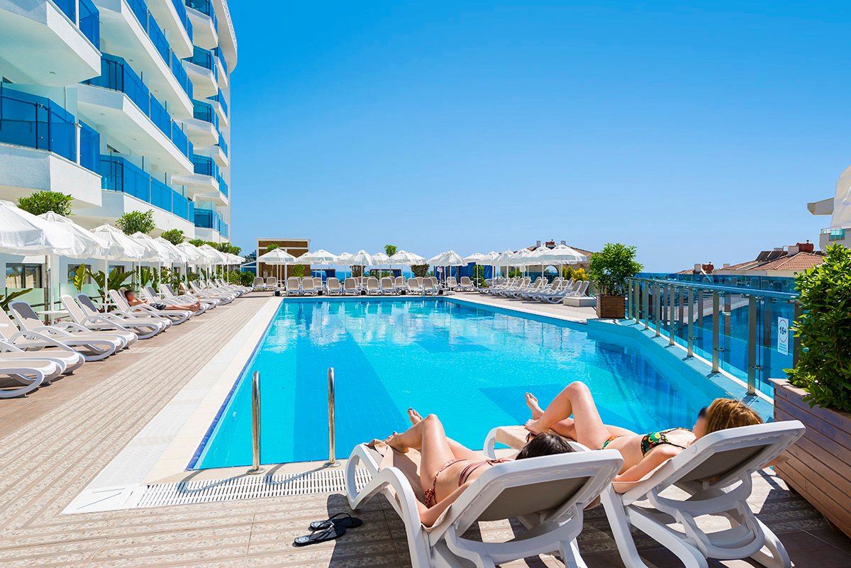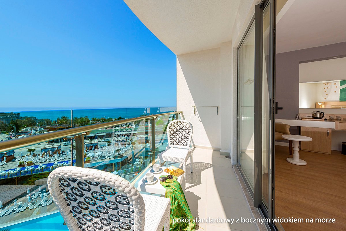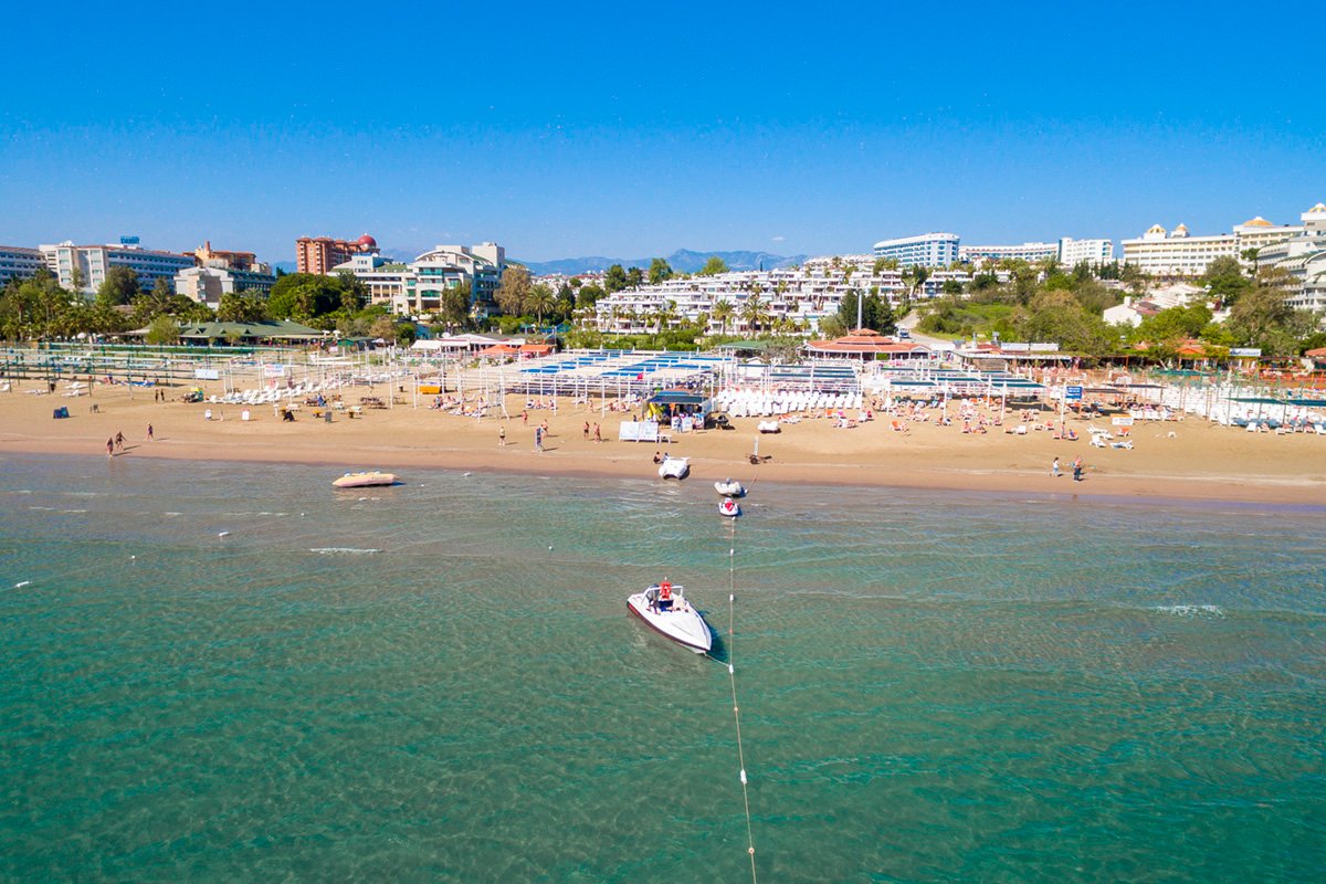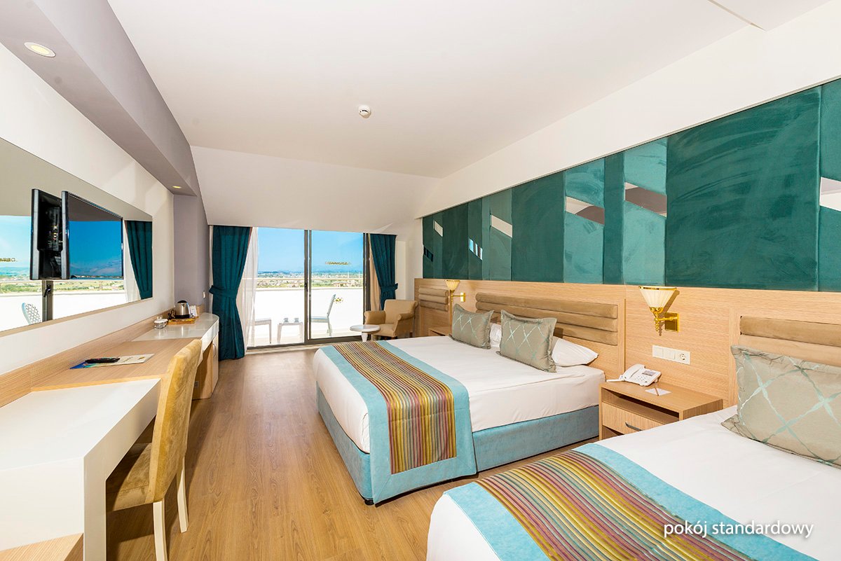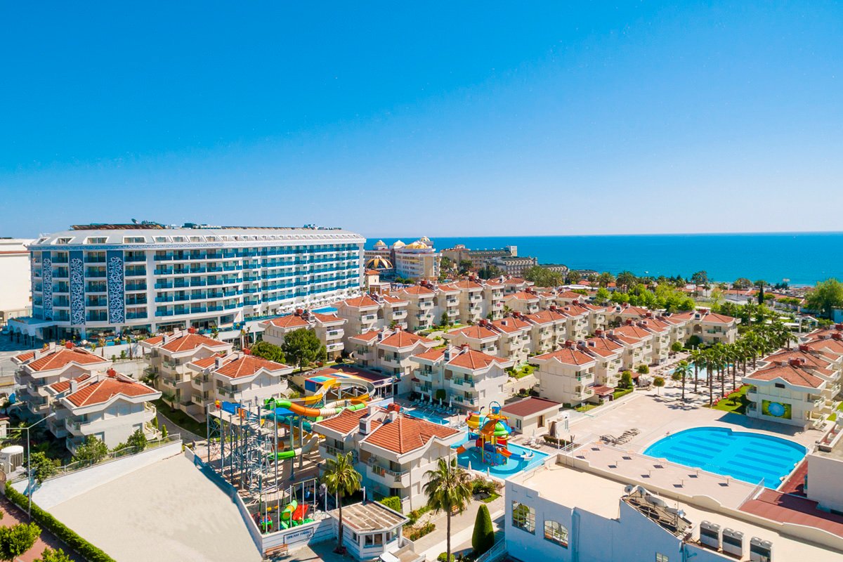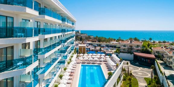 Nowoczesny i elegancki, zaprasza na rodzinne wakacje na słonecznej Riwierze Tureckiej. Centralnym punktem hotelu są ładnie zaprojekowane baseny, gdzie można się zrelaksować lub wziąć udział w sportowych animacjach. Dla najmłodszych przygotowano zabawy w miniklubie, Goście mogą również korzystać z basenów i zjeżdżalni na terenie sąsiedniego hotelu. Na miejscu jest aż 5 barów i 4 restauracje, w tym 3 à la carte serwujące dania kuchni włoskiej i tureckiej. Komfortowy wypoczynek zapewnią przestronne pokoje standardowe i 2-pomieszczeniowe pokoje rodzinne wyposażone we wszystkie niezbędne udogodnienia. Warto również wybrać się do centrum Kumkoy z licznymi sklepami oraz na plażę, do której można wygodnie dojechać hotelowym busem.