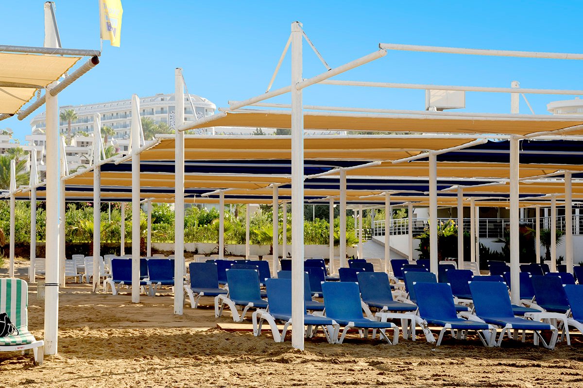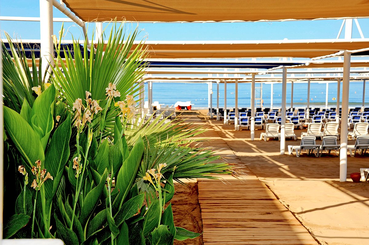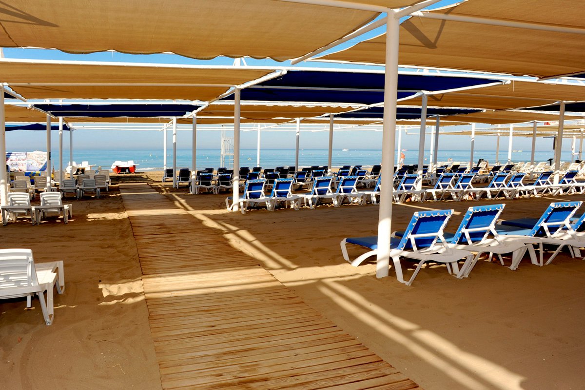 hotelowa, piaszczysta, łagodne zejście do morza, ok. 600 m od hotelu, dojście ulicą lub dojazd bezpłatnym hotelowym busem (kursuje co ok. 30 min.), bezpłatne parasole, leżaki, materace i ręczniki, bar objety all inclusive.