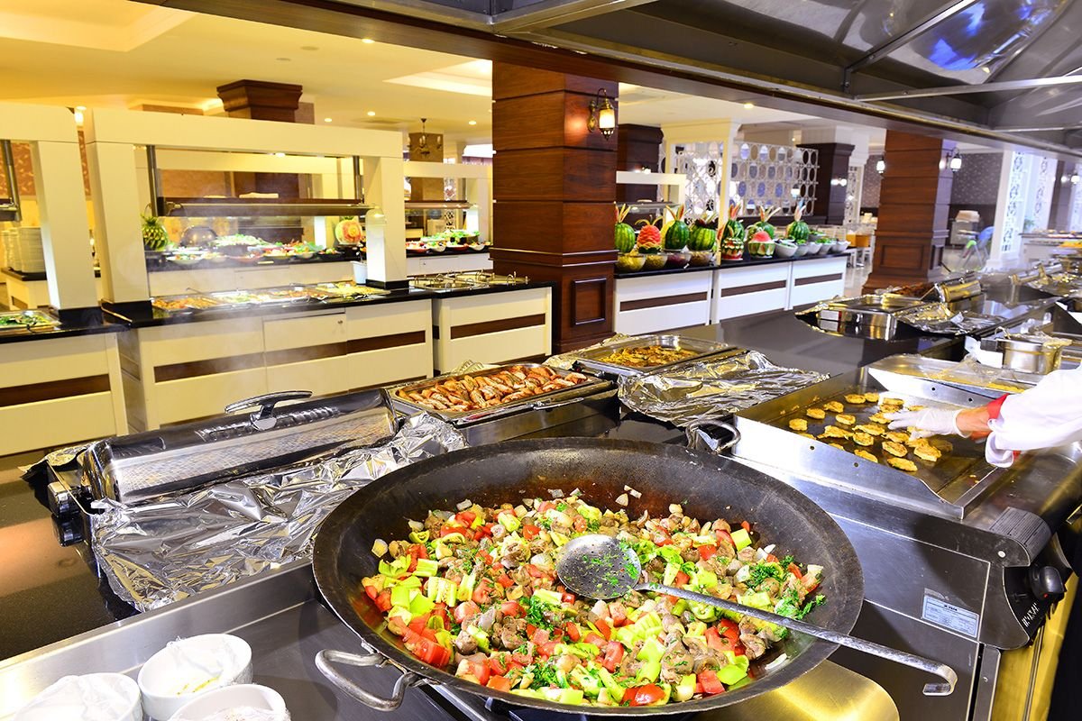 śniadanie (7.00-10.00), późne śniadanie (10.00-10.30), obiad (12.30-14.00), kolacja (19.00-21.00) w formie bufetu w restauracji głównej; przekąski (12.00-16.00), podwieczorek (16.00-16.45); napoje bezalkoholowe i lokalne napoje alkoholowe w wyznaczonym barze (10.00-24.00).
