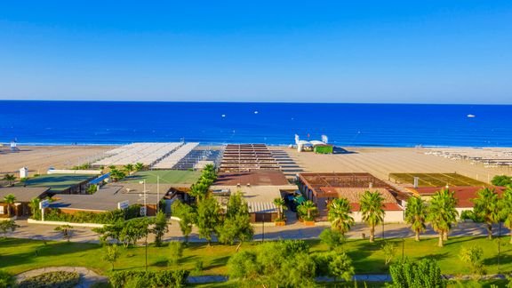 hotelowa, piaszczysta, łagodne zejście do morza, wyróżniona certyfikatem Błękitna Flaga, ok. 300 m od hotelu, dojazd bezpłatnym hotelowym busem, bezpłatne parasole, leżaki, materace i ręczniki; bar objęty all inclusive.