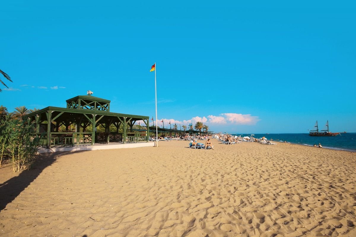 szeroka, piaszczysta, długa na 700 m, łagodne zejście do morza, bezpośrednio przy hotelu, bezpłatne parasole, leżaki, materace i ręczniki; bar hotelowy objęty all inclusive – napoje chłodzące, przekąski w ciągu dnia.