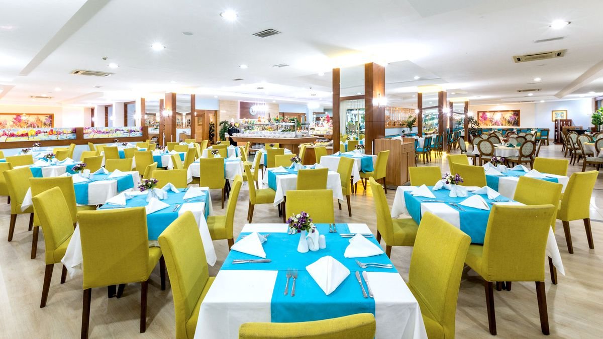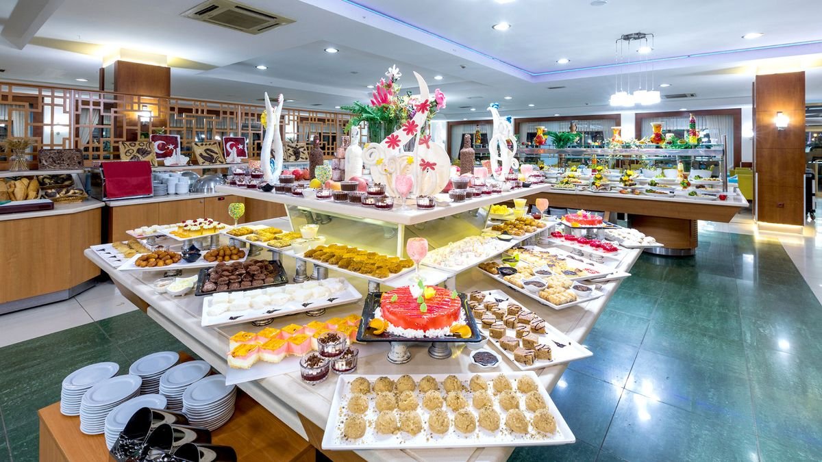śniadanie (7.00-10.00), późne śniadanie (10.00-10.30), obiad (12.30-14.00), kolacja (19.00-21.00), nocna zupa (23.00-24.00) w formie bufetu w restauracji głównej; kawa, ciasto w wyznaczonym miejscu (11.00-17.00); przekąski w barze na plaży (12.00-16.00); lody w barze przy basenie; napoje bezalkoholowe i lokalne napoje alkoholowe w wyznaczonym barze (10.00-24.00); raz na pobyt kolacja w restauracji à la carte (wymagana wcześniejsza rezerwacja); wymagane noszenie opasek all inclusive.