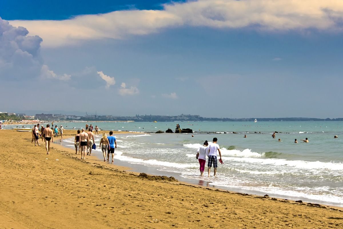 hotelowa, piaszczysta, szeroka, łagodne zejście do morza, wyróżniona certyfikatem Błękitna Flaga, bezpośrednio przy hotelu, przejście przez hotelowy ogród i promenadę, bezpłatne parasole, leżaki i materace, ręczniki za opłatą (ok. 1 EUR/dzień), leżaki umieszczone są pod baldachimami; bar objęty formułą all inclusive.