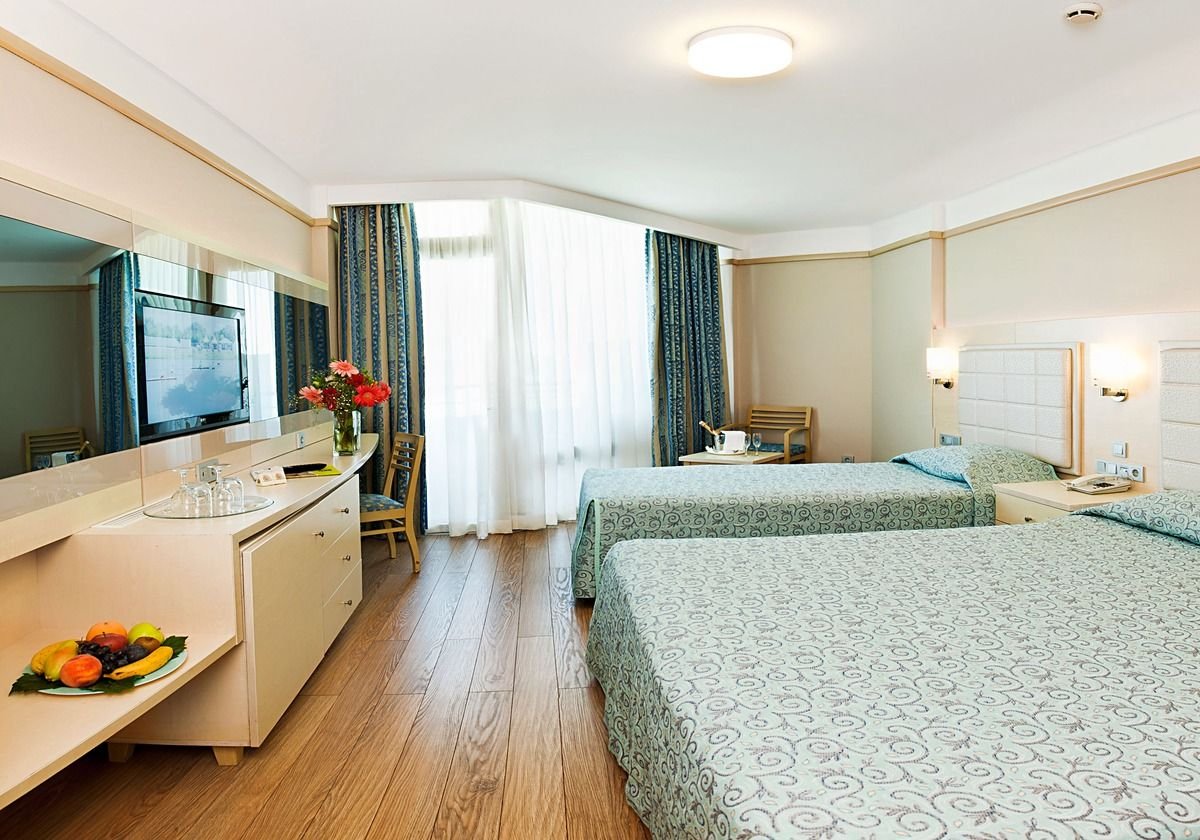 standardowy: 2-os. (możliwość 1 dostawki), ok. 24 m², klimatyzowany, łazienka (wanna lub prysznic, wc; suszarka), telewizja satelitarna, polski program, telefon, minibar (codziennie uzupełniany w napoje bezalkoholowe), sejf; za opłatą: internet przewodowy (ok. 5 EUR/dzień, 15 EUR/tydz.); bezpłatne łóżeczko dla dziecka do 2 lat na zamówienie przed przyjazdem; balkon lub taras (stolik i krzesełka, suszarka), większość pokoi z widokiem na morze; rodzinny: dla maks. 4 os. (łożko piętrowe dla dwójki dzieci), ok. 29 m², wyposażenie jak w pokoju standardowym; pokoje rodzinne za dopłatą.