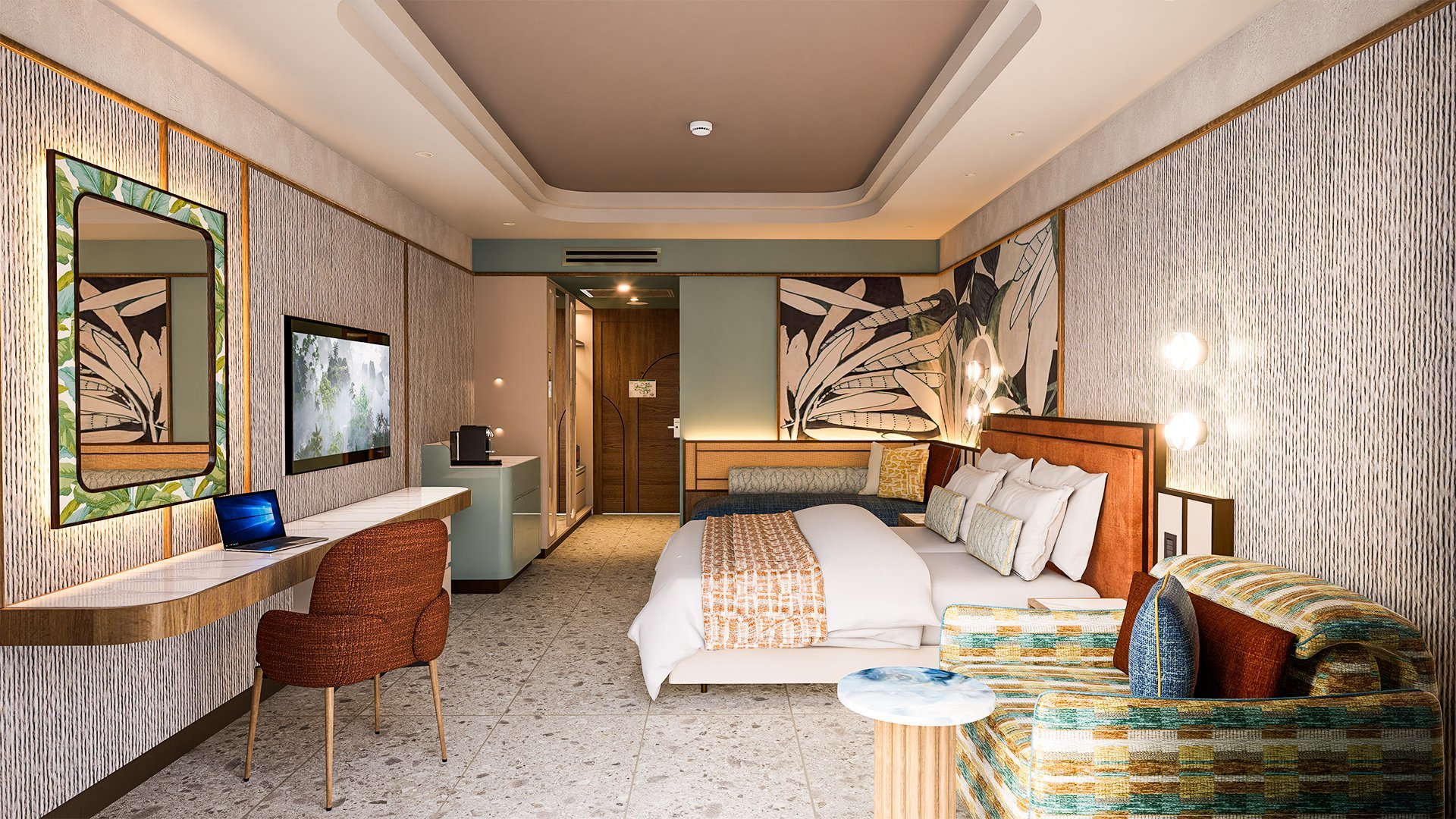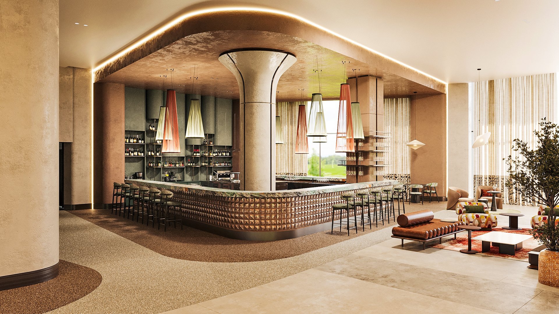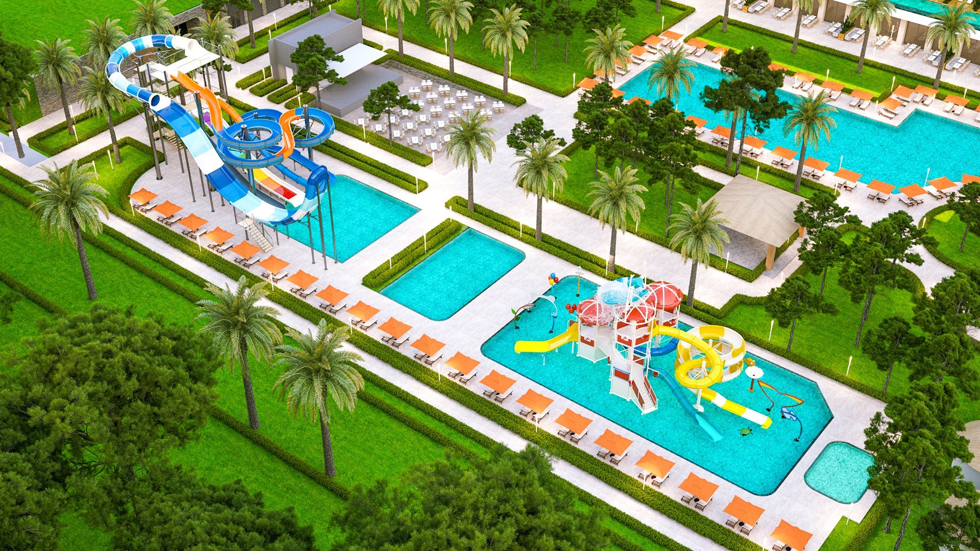 Stylowy, pachnący nowością, zachwyca połączeniem elegancji, komfortu i swobodnej wakacyjnej atmosfery. Każdy zakątek hotelu – od przestronnych, nowocześnie urządzonych pokoi, po luksusowe spa, został zaprojektowany tak, by Goście czuli się tu wyjątkowo. Restauracje rozpieszczają podniebienia różnorodnym menu, serwując zarówno lekkie przekąski, jak i wykwintne dania, a ulubionym miejscem do relaksu są ładnie zaaranżowane baseny otoczone ogrodem i leżakami. Miłośnicy plażowania mogą odwiedzić pobliską hotelową plażę, by poopalać się i popływać w morzu, na najmłodszych z kolei czekają zajęcia z animatorami, zabawa w mini i teen clubie i coś, co spodoba się im najbardziej, czyli basen z 4 zjeżdżalniami. Prezentowany materiał graficzny przedstawia wizualizację obiektu.
