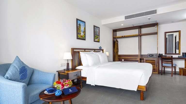 Widoki jak marzenie! Położony na wybrzeżu, przy pięknej plaży z palmami zaprasza na rajski urlop w Wietnamie. Otoczony zielonymi wzgórzami, idealnie wtapia się w otaczający go krajobraz. Doskonale będą się tu bawić rodziny z dziećmi, na które czeka mnóstwo atrakcji – basen infinity z kolorowymi zjeżdżalniami, miniklub, plac zabaw, animacje i bogata oferta sportowa, w tym sporty wodne. Hotel słynie z doskonałej obsługi i świetnej, lokalnej kuchni, na miejscu są też 2 bary, w których schłodzisz się kolorowym koktajlem. Lubisz zwiedzać? Tutaj będziesz w swoim żywiole! Podziwiaj malowniczą okolicę i kolorowe okrągłe łódki kołyszące się na falach oraz zaplanuj dzień pełen wrażeń i zachwyć się słynnymi białym i czerwonym wydmami, a nawet wypożycz deskę i spróbuj sandbordingu!