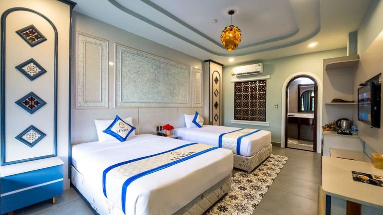 Idealnie wkomponowany w krajobraz, otoczony kokosowym gajem i urządzony w kolorach ziemi, jest prawdziwą, rajską oazą. Położony w sercu Mui Ne, czaruje stylem inspirowanym klasycznym, europejskim wzornictwem. Już od wejścia przyciąga wyjątkową gościnnością i zapierającymi dech widokami na ocean. W hotelu pięknie zaaranżowne baseny, w tym infinity, tuż obok cudowna plaża, idealna do błogiego lenistwa na leżaku i uprawiania sportów wodnych, a wieczorami podziwiania romantycznych zachodów słońca. Koniecznie zaplanuj kolację w restauracji CATCH, która wyglądem przypomina legendarnego Titanica! To świetny wybór na wczasy z rodziną – dzieciaki mogą tu szaleć na zjeżdżalniach i wodnym placu zabaw.