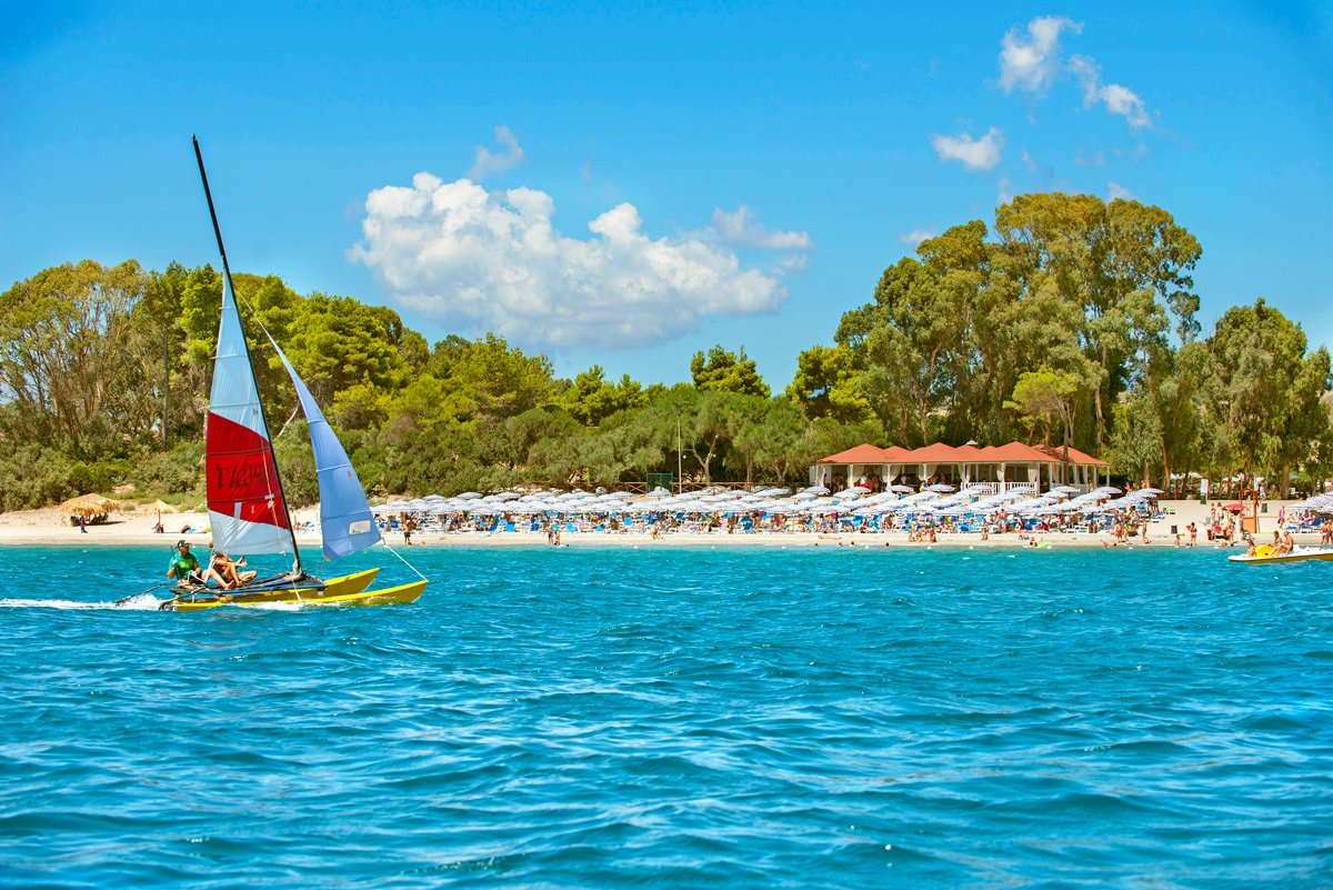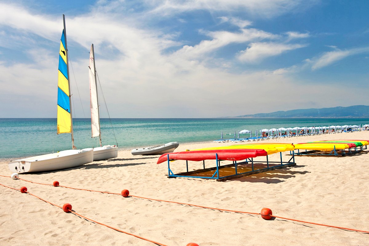 Simeri Mare, hotelowa, piaszczysto-żwirowa, miejscami kamienie w wodzie, zalecane obuwie ochronne, łagodne zejście do morza, miejscami głęboka woda blisko brzegu, ok. 30-100 m od hotelu (zależnie od zakwaterowania), dojście alejką przez teren hotelu, bezpłatne parasole i leżaki (od 3. rzędu), ręczniki plażowe za kaucją (ok.10 EUR/pobyt).