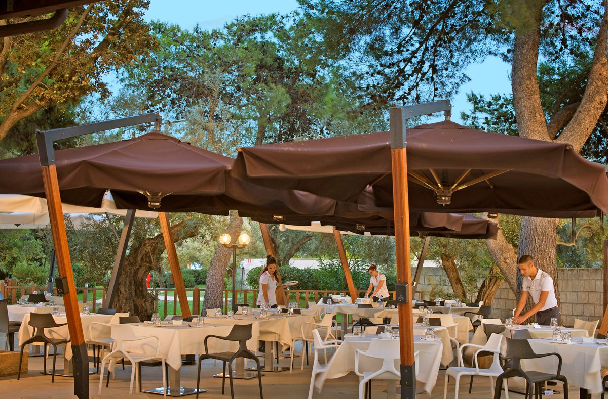 śniadanie (7.30-9.00), obiad (12.30-14.15), kolacja (19.30-21.15) w formie bufetu w restauracji głównej, do posiłków głównych nielimitowane piwo, wino, napoje bezalkoholowe; przekąski po południu; lokalne napoje bezalkoholowe i lokalne alkohole w wyznaczonych barach (10.00-23.00); wymagane noszenie opasek all inclusive.