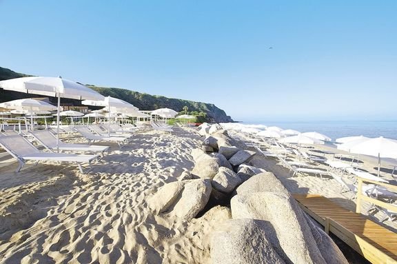 prywatna, długa, piaszczysto-żwirkowa, łagodne zejście do morza, bezpośrednio przy hotelu, parasole i leżaki płatne (ok. 10 EUR/dzień), ręczniki za kaucją.