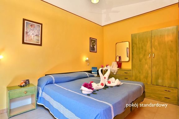 standardowy: 2-os. (możliwość 1 dostawki), ok. 23 m², indywidulanie sterowana klimatyzacja, łazienka (prysznic, wc; suszarka), pokój dzienny, telewizor, sejf (płatny); ogródek (stolik i krzesła); rodzinny: 2-os. (możliwość 2 dostawek), ok. 25-32 m², wyposażenie jak w pokoju standardowym, dodatkowa osobna sypialnia; bezpłatne łóżeczko dla dziecka do 2 lat na zamówienie przed przyjazdem; pokój rodzinny na dopłatą.