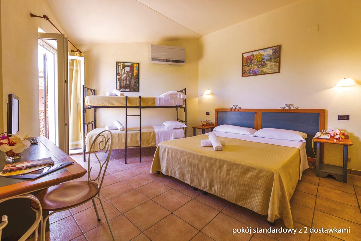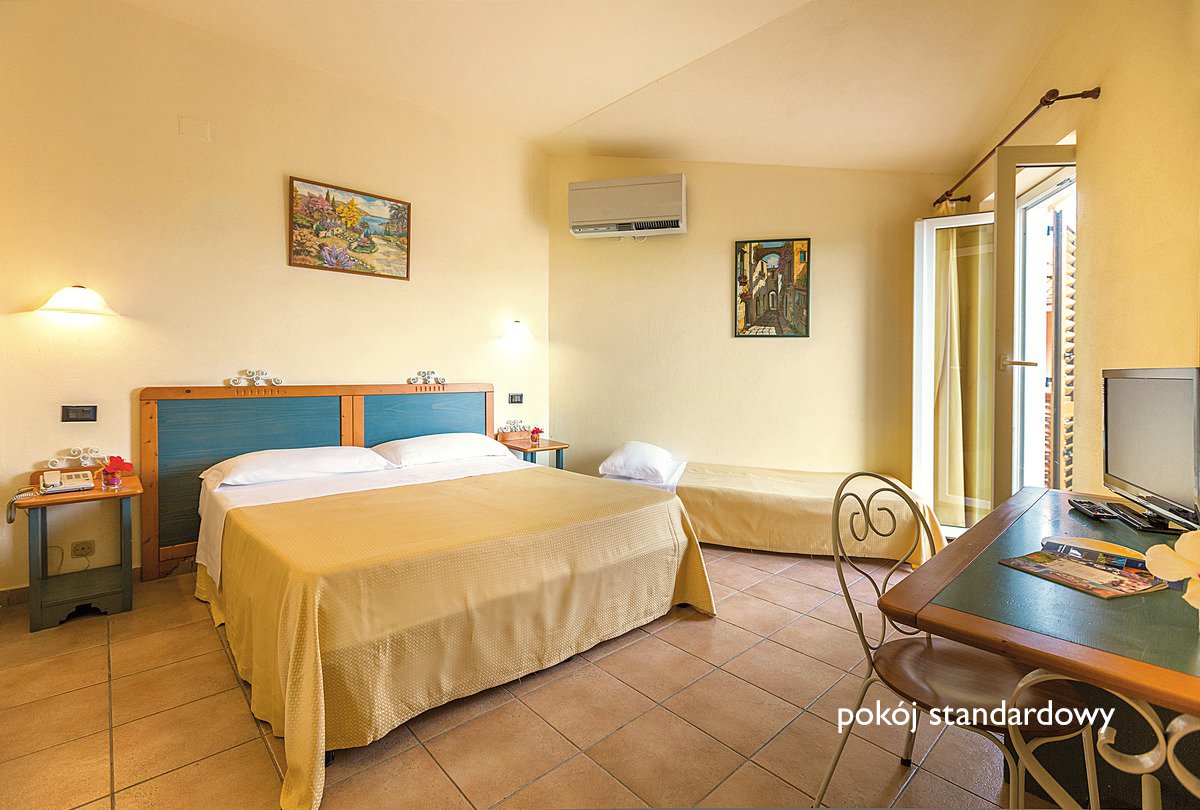 standardowy: standardowy: 2-os. (możliwość 1 lub 2 dostawek – łóżko piętrowe), ok. 15 m², zadbany, klimatyzowany, łazienka (prysznic, wc; suszarka), telewizor, telefon, lodówka, sejf; bezpłatne łóżeczko dla dziecka do 2 lat na zamówienie przed przyjazdem; niektóre pokoje posiadają balkon lub taras (stolik i krzesełka).