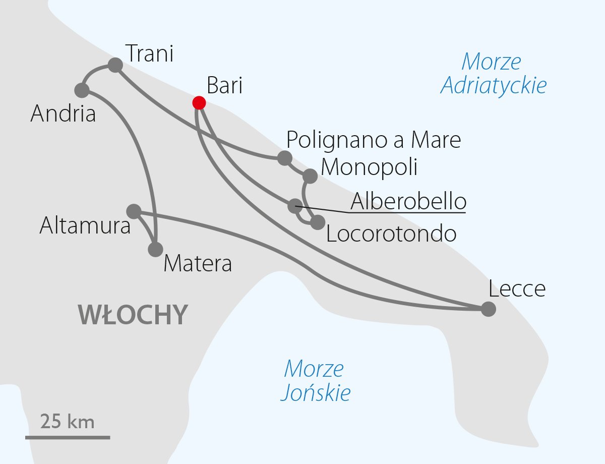 Zapraszamy na interesującą wyprawę na południe Włoch, do coraz bardziej rozpoznawanego przez polskich turystów, głównie dzięki pięknym piaszczystym plażom, regionu Apulia. Jednak ten region to nie tylko piaszczyste plaże – Apulia obfituje w niezliczone pamiątki z minionych epok, piękne pejzaże, białą zabudowę miasteczek przypominającą Grecję oraz smaczną i bogatą kuchnię. W programie również Matera, skalne miasto znane z filmów: Pasja Mela Gibsona i z ostatniego filmu z przygodami Jamesa Bonda (z 2021 r.). Ponadto, bajkowe Alberobello z domkami trulli, a fakultatywne wizyta w restauracji serwującej lokalne potrawy. Przejazdy na miejscu są krótkie, więc czas spędza się głownie na zwiedzaniu i wypoczynku. Zapraszamy do Apulii!