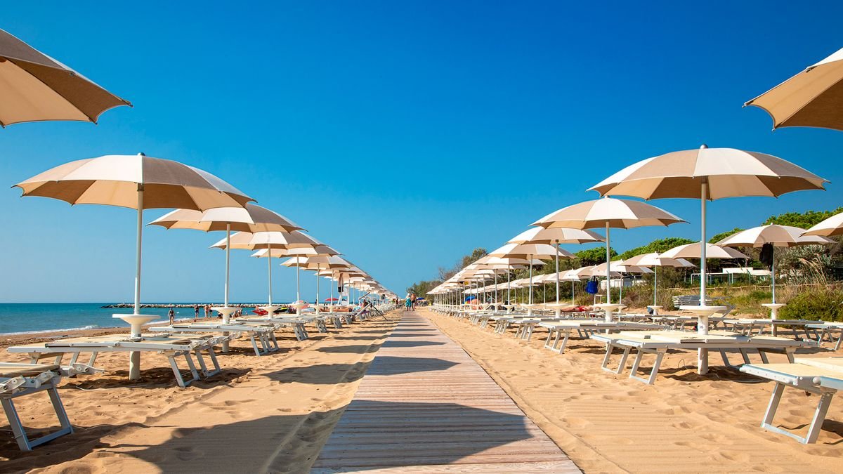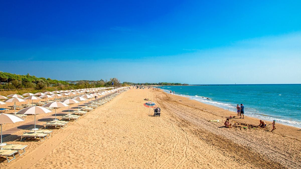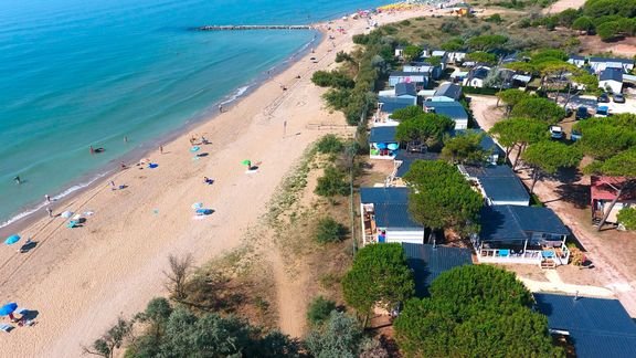 piaszczysta, łagodne zejście do morza, bezpośrednio przy kempingu (w zależności od zakwaterowania), parasole i leżaki płatne (ok. 20 EUR/komplet).