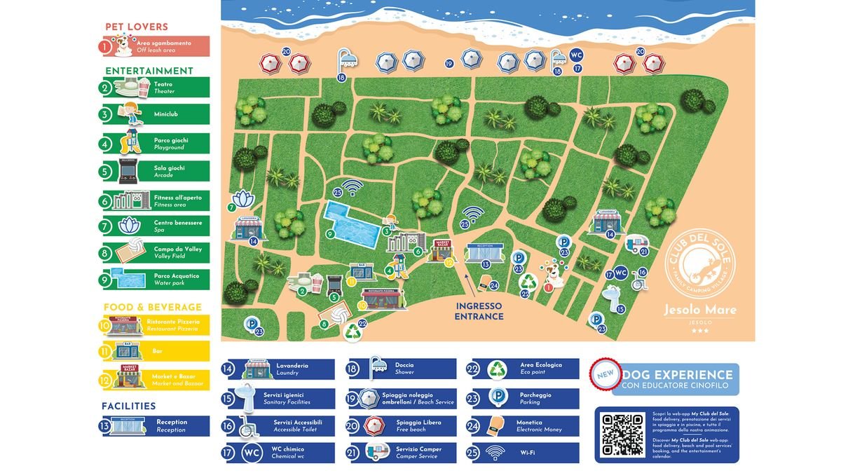 basen, wydzielona część dla dzieci ze zjeżdżalniami, przy basenie bezpłatne leżaki; strefa fitness; miniklub, plac zabaw dla dzieci, animacje dla dorosłych i dzieci, (w terminie: maj-wrzesień); za opłatą: centrum spa: jacuzzi, hammam, masaże; oferta zewnętrzna (płatne): park rozrywki New Jesolandia, Tropicarium Park (ok. 20 EUR/os., więcej szczegółów na www.tropicarium.it).