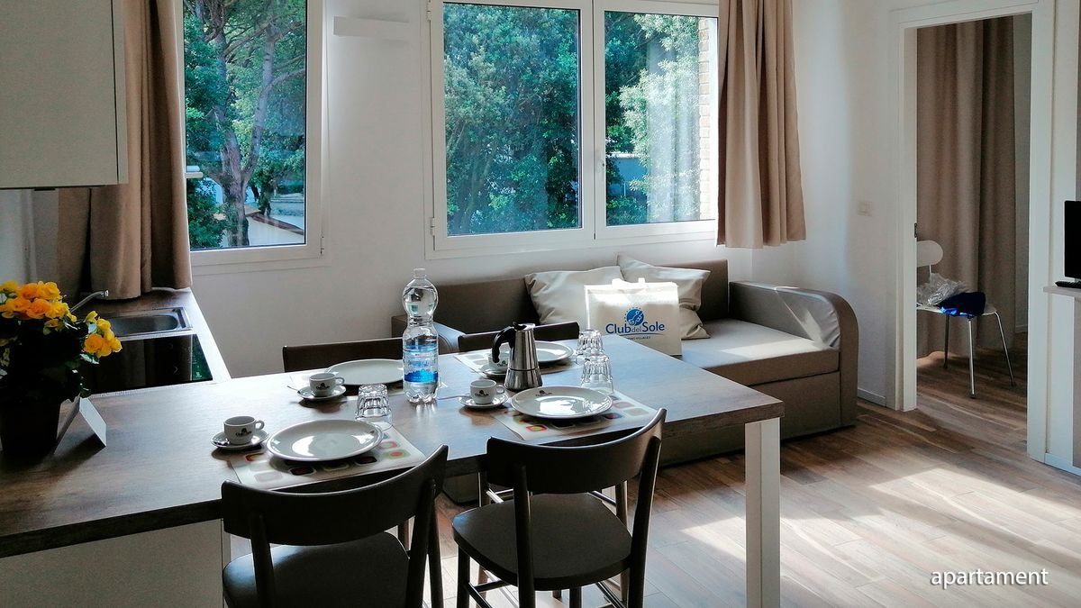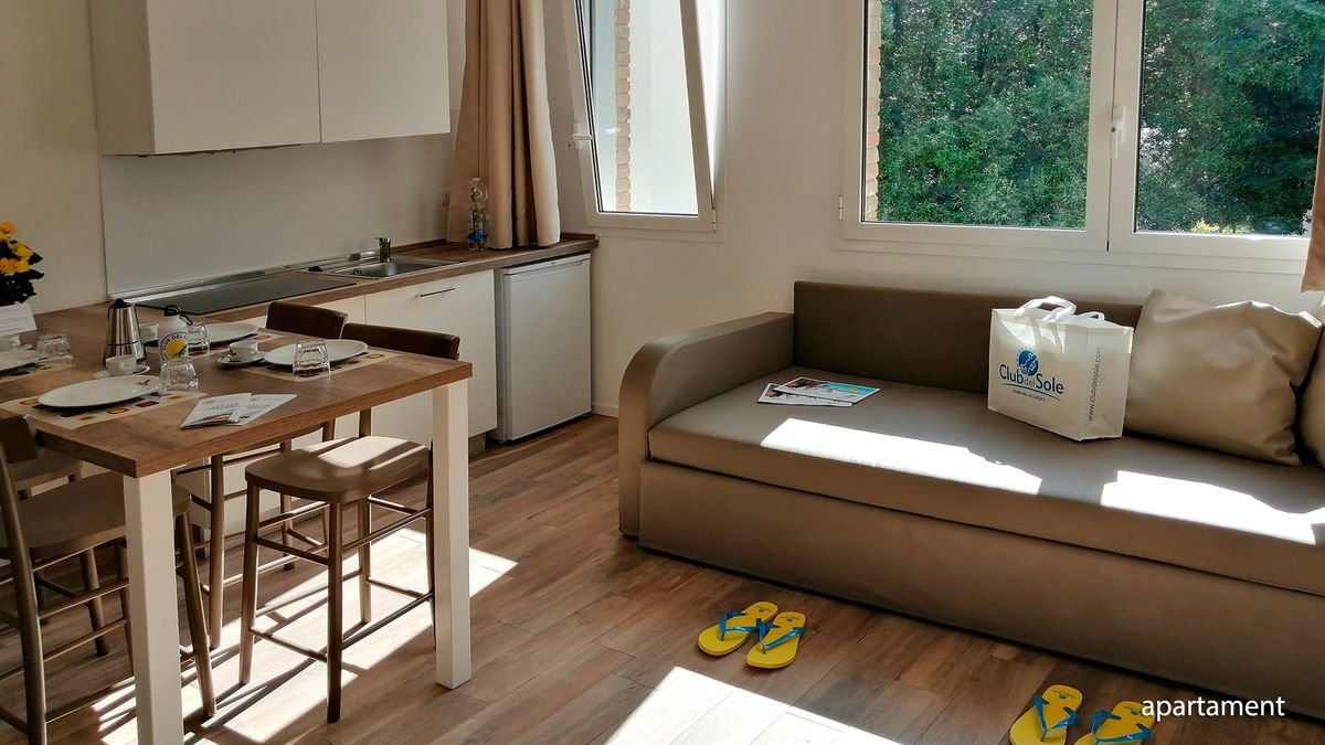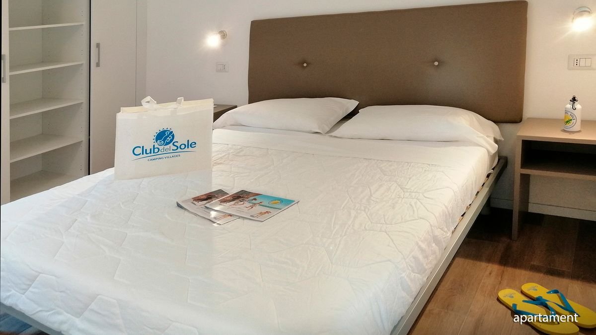 apartament: 2-os. (możliwość 1 lub 2 dostawek), ok. 50 m², klimatyzowany (pierwsze 50 godz. bezpłatnie, każde kolejne 50 godz. płatne 10 EUR), łazienka (prysznic, wc), 2 sypialnie, salon, wyposażony aneks kuchenny, telewizor; za opłatą: ręczniki (ok. 8 EUR/zestaw), pościel (ok. 8-16 EUR/zestaw);