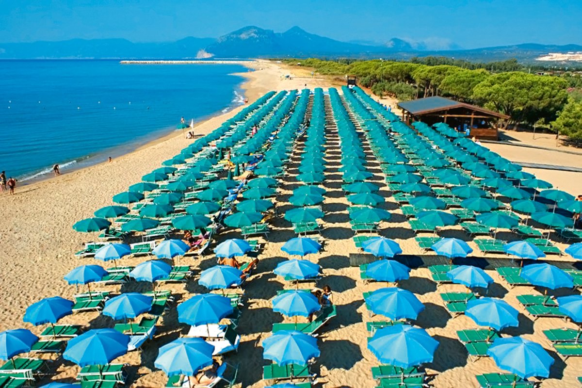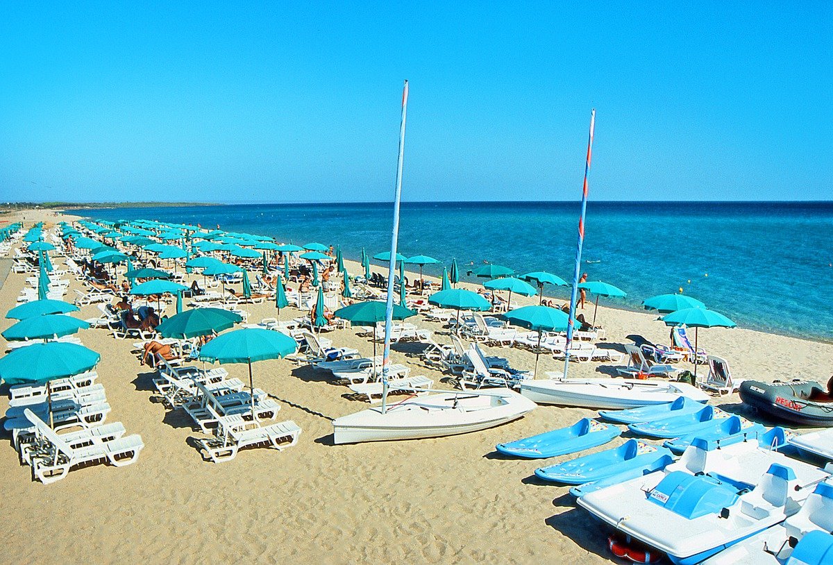 w zatoce Orosei, publiczna, wydzielony odcinek hotelowy, długa i szeroka, piaszczysto-żwirkowa, ok. 100 m od hotelu (do 300 m, zależnie od zakwaterowania), dojście ścieżką hotelową i drewnianym mostem, bezpłatne parasole i leżaki (2 leżaki i 1 parasol/pokój; leżaki w 1. i 2. rzędzie dodatkowo płatne).